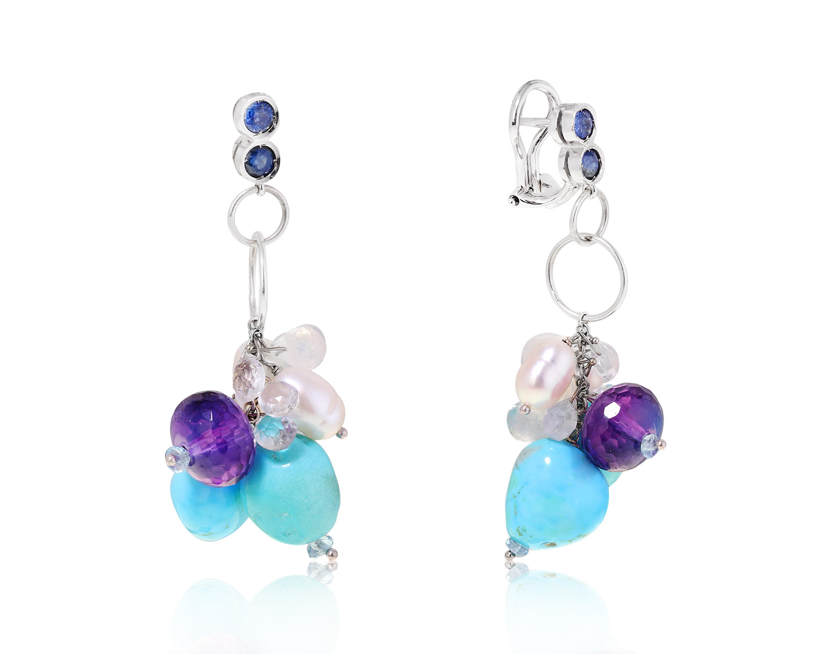 - пусеты с крупной центральной инкрустацией в окружении мелких вставок сапфиров и бриллиантов;