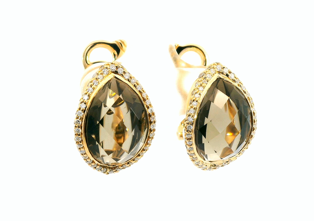 Представляем вашему вниманию оригинальные золотые серьги с дымчатым кварцем 12.77ct, коньячными 0.35ct и бесцветными 0.26ct бриллиантами от всемирно известного бренда Belle Bague (GIM).