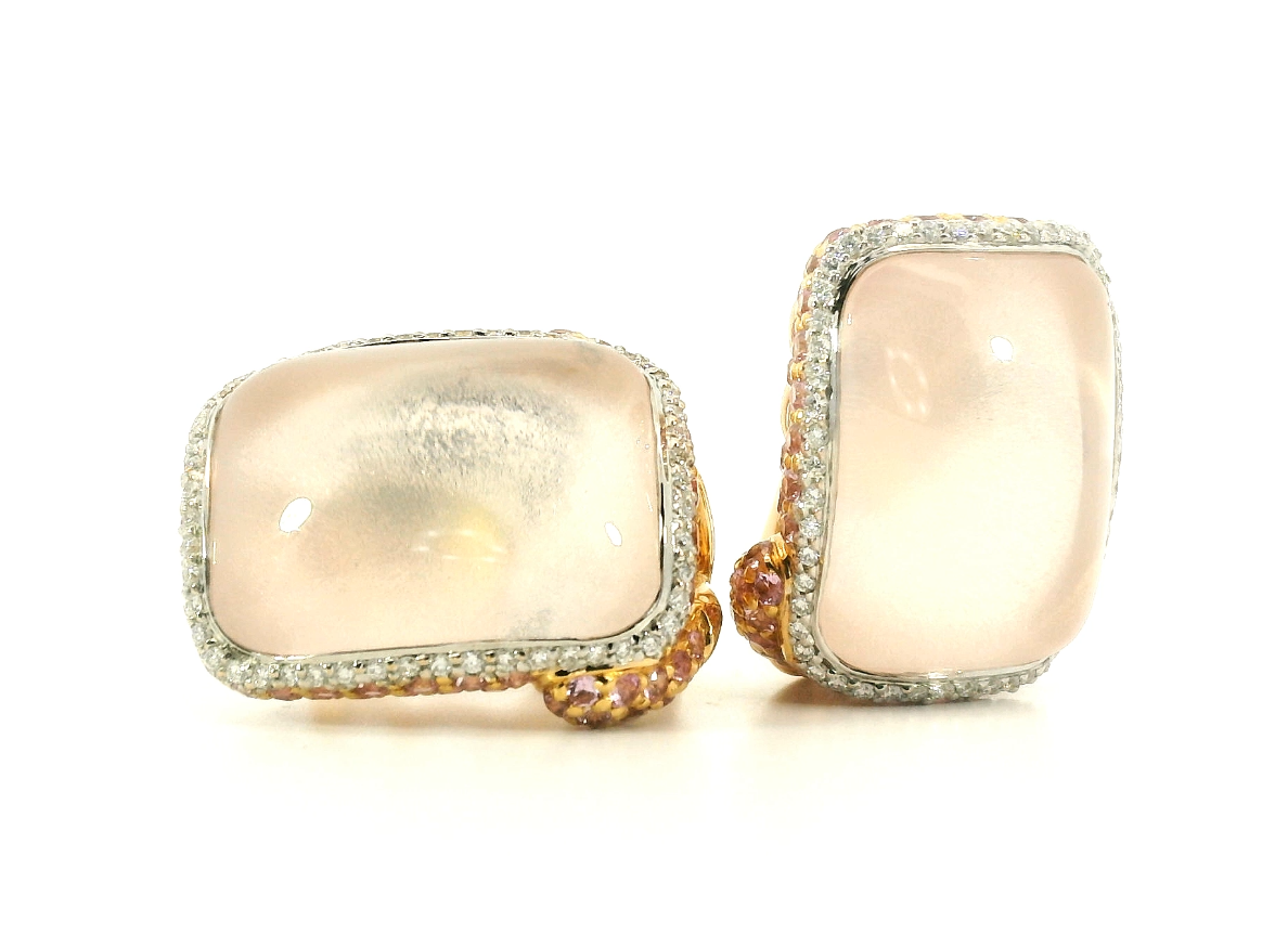 Представляем вашему вниманию оригинальные золотые серьги с розовым кварцем 39.06ct, розовыми сапфирами 4.85ct и бриллиантами 0.53ct от всемирно известного бренда Belle Bague (GIM).
