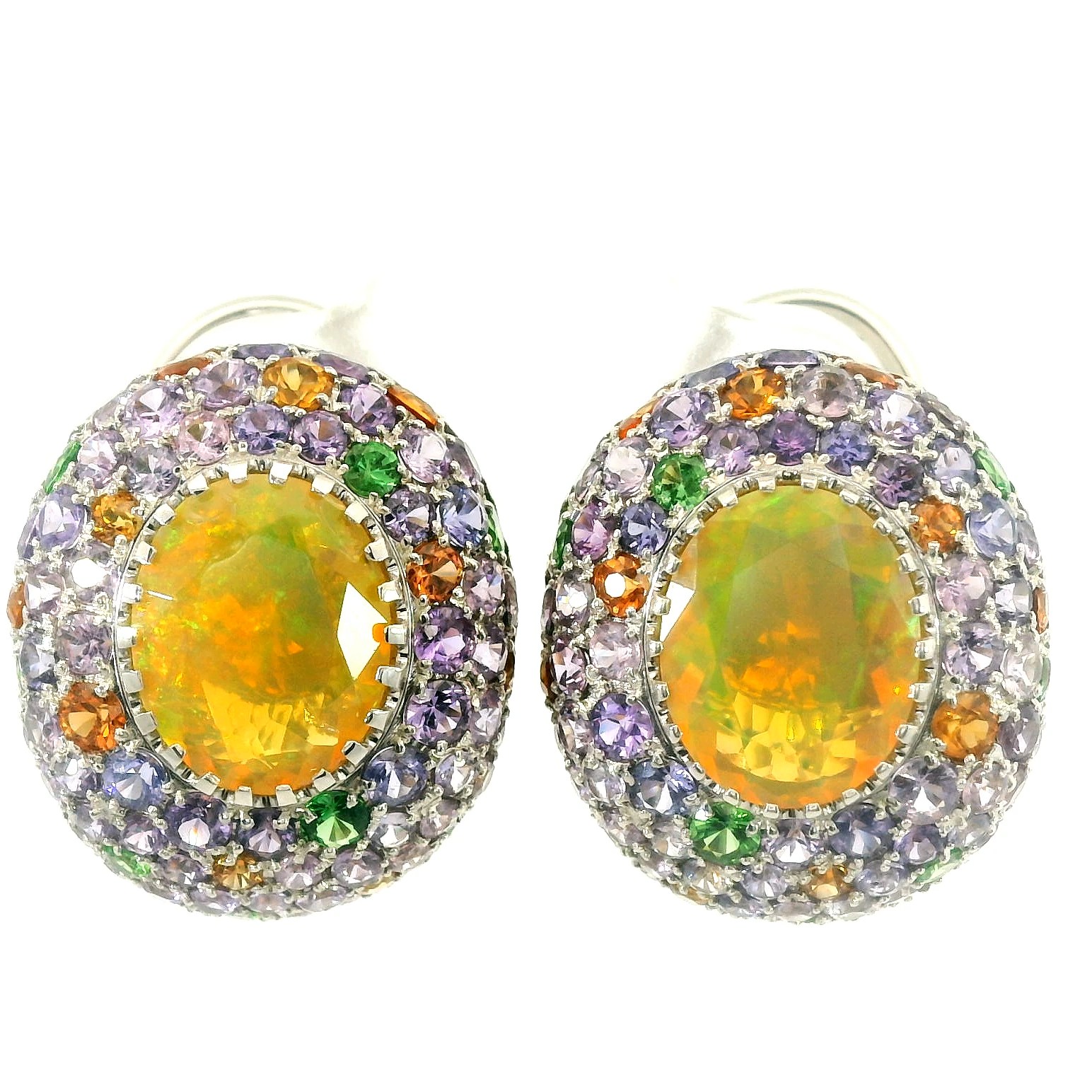 Представляем вашему вниманию оригинальные золотые серьги с огненными опалами 2.44ct, оранжевыми 1.42ct и сиреневыми 5.17ct сапфирами и тсаворитами 0.63ct от всемирно известного бренда Mousson.