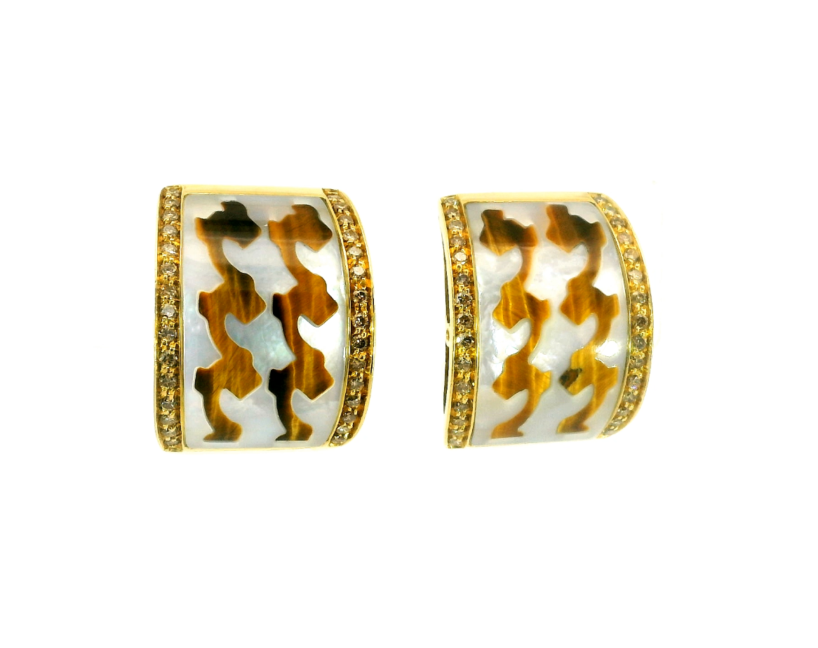 Представляем вашему вниманию оригинальные золотые серьги с инкрустированным перламутром, тигровым глазом, рубином 0.06ct и бриллиантами 0.66ct от всемирно известного бренда Roberto Coin.