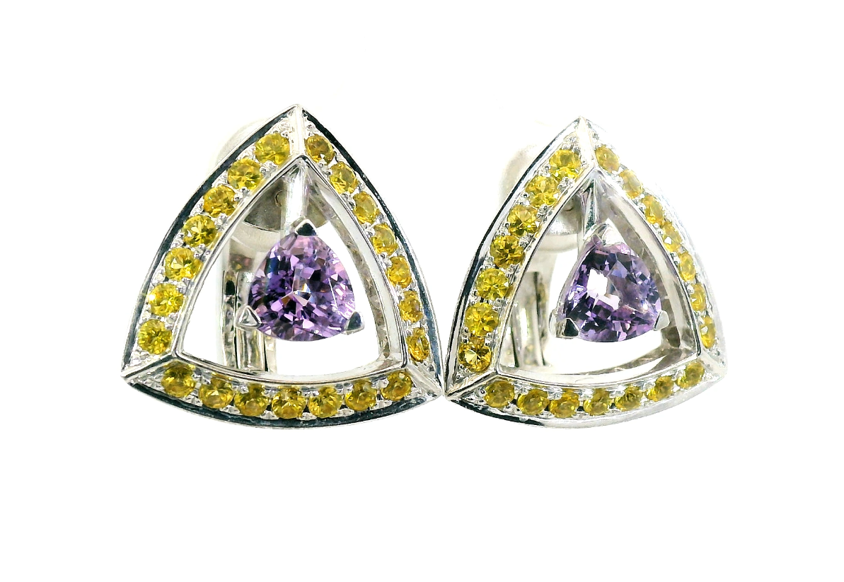 Представляем вашему вниманию оригинальные золотые серьги с желтыми 1.26ct и розовыми 1.44ct сапфирами и аметистами 1.20ct от всемирно известного бренда Mauboussin.