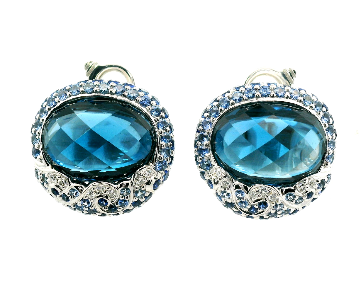 Представляем вашему вниманию оригинальные золотые серьги с топазами London Blue 26.78ct, сапфирами 3.14ct и бриллиантами 0.13ct от всемирно известного бренда Belle Bague (GIM).