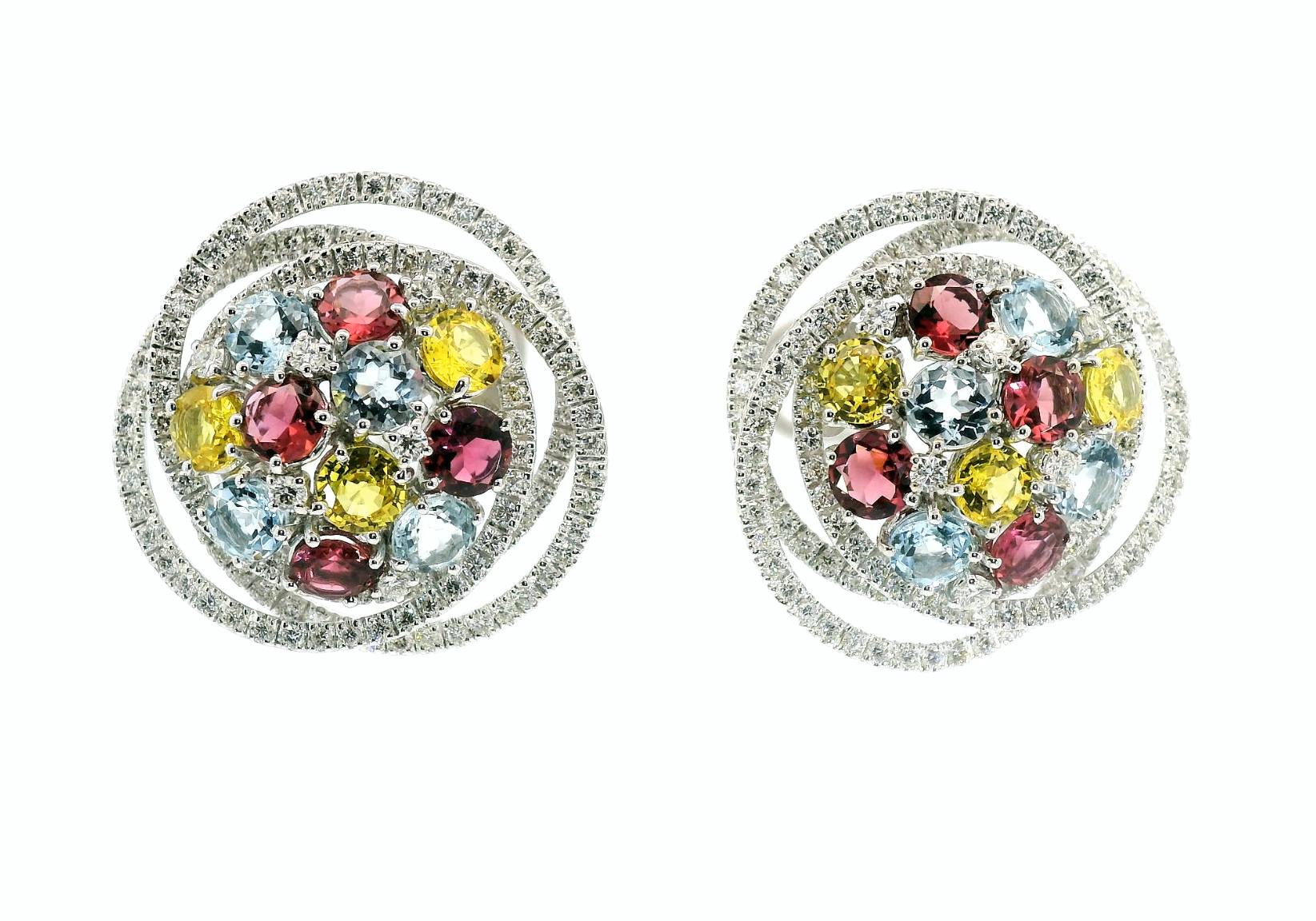 Представляем вашему вниманию оригинальные золотые серьги с аквамаринами 3.76ct, турмалинами 4.16ct, желтыми сапфирами 3.54ct и бриллиантами 3.36ct от всемирно известного бренда Leo Pizzo.