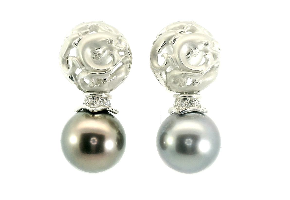 Представляем вашему вниманию оригинальные золотые серьги с черным жемчугом 12.30 мм и бриллиантами 0.15ct от всемирно известного бренда Carrera y Carrera из коллекции Dolphin.