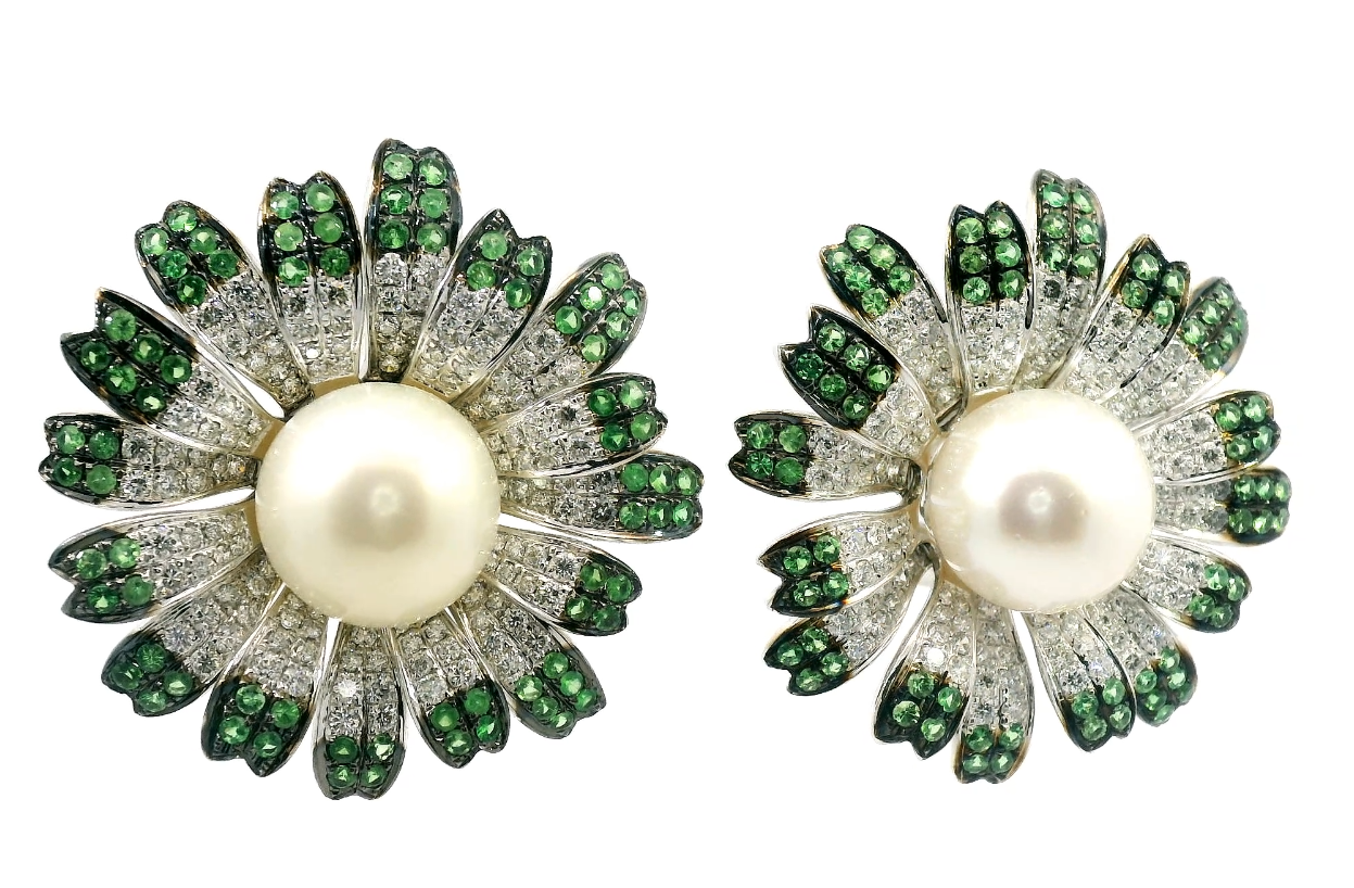 Представляем вашему вниманию романтичные золотые серьги с жемчугом 12.30 мм, бриллиантами 2.56ct и хризолитами 2.36ct.