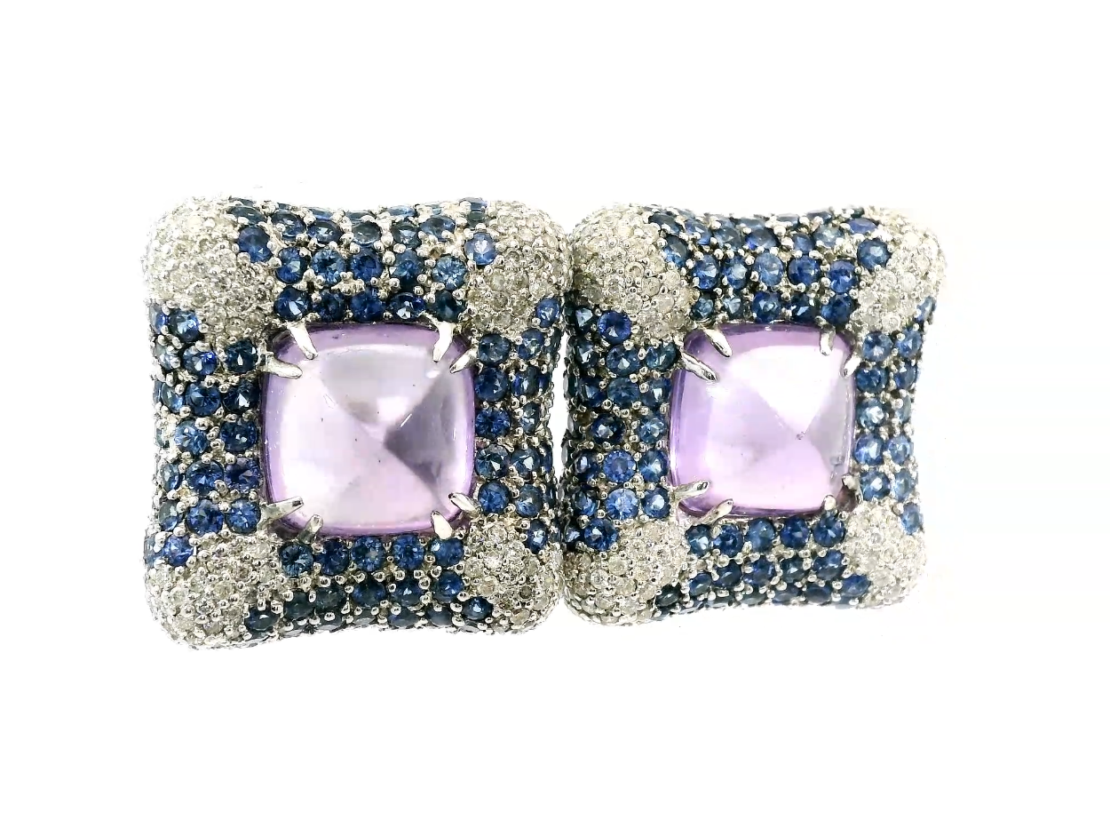 Представляем вашему вниманию великолепные золотые серьги с аметистами 12.86ct, сапфирами 7.70ct и бриллиантами 2.00ct.
