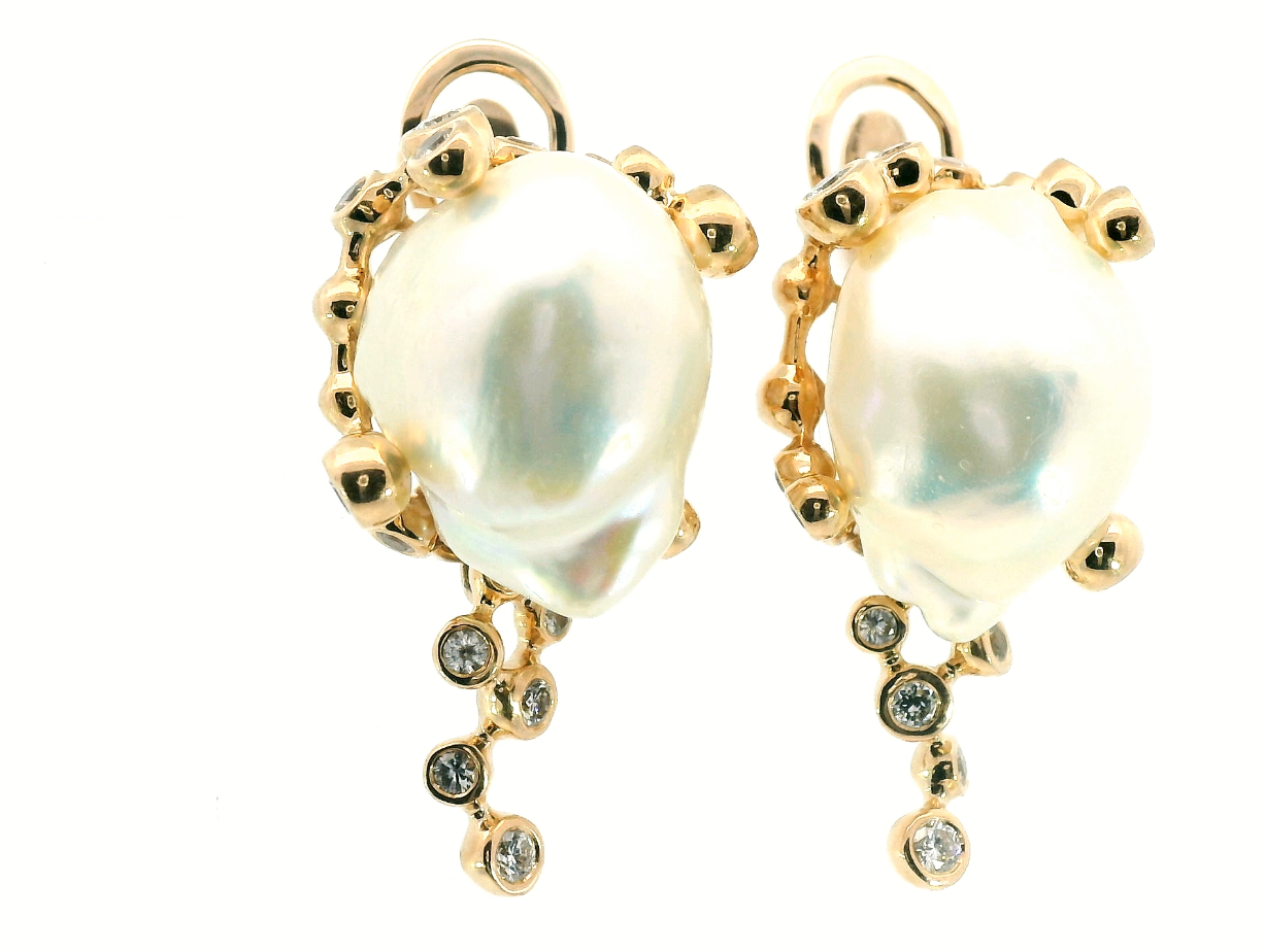 Представляем вашему вниманию золотые серьги с барочным жемчугом 15.00-21.00 мм, лейкосапфирами 1.60ct и бриллиантами 0.65ct.