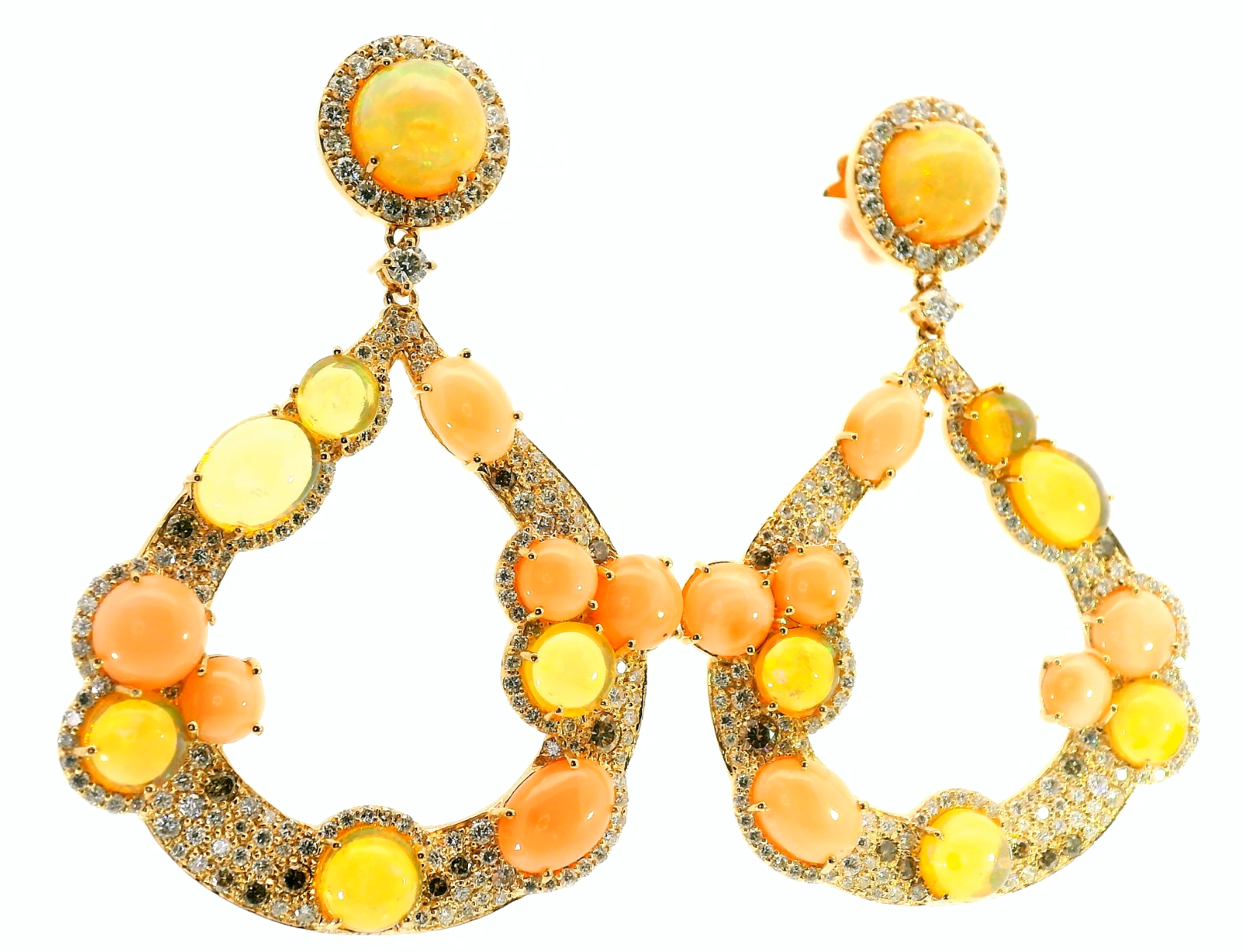 Представляем вашему вниманию золотые серьги с благородными опалами 8.96ct, розовыми кораллами 6.54ct, бесцветными 2.73ct и коньячными 0.30ct бриллиантами.