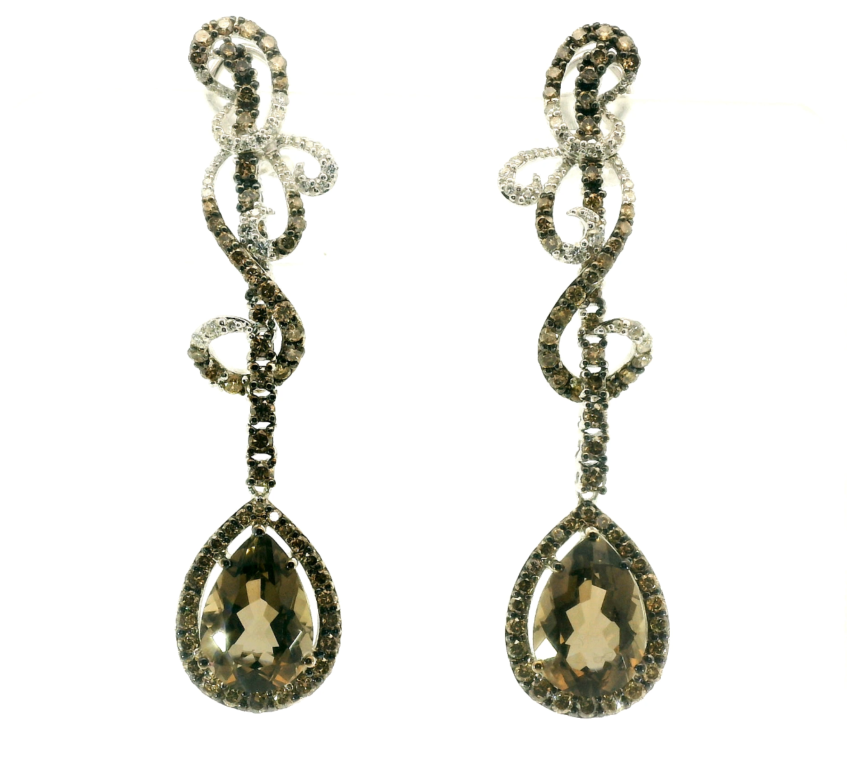 Представляем вашему вниманию золотые серьги с дымчатым кварцем 7.35ct, бесцветными 0.40ct и коньячными 2.15ct бриллиантами.
