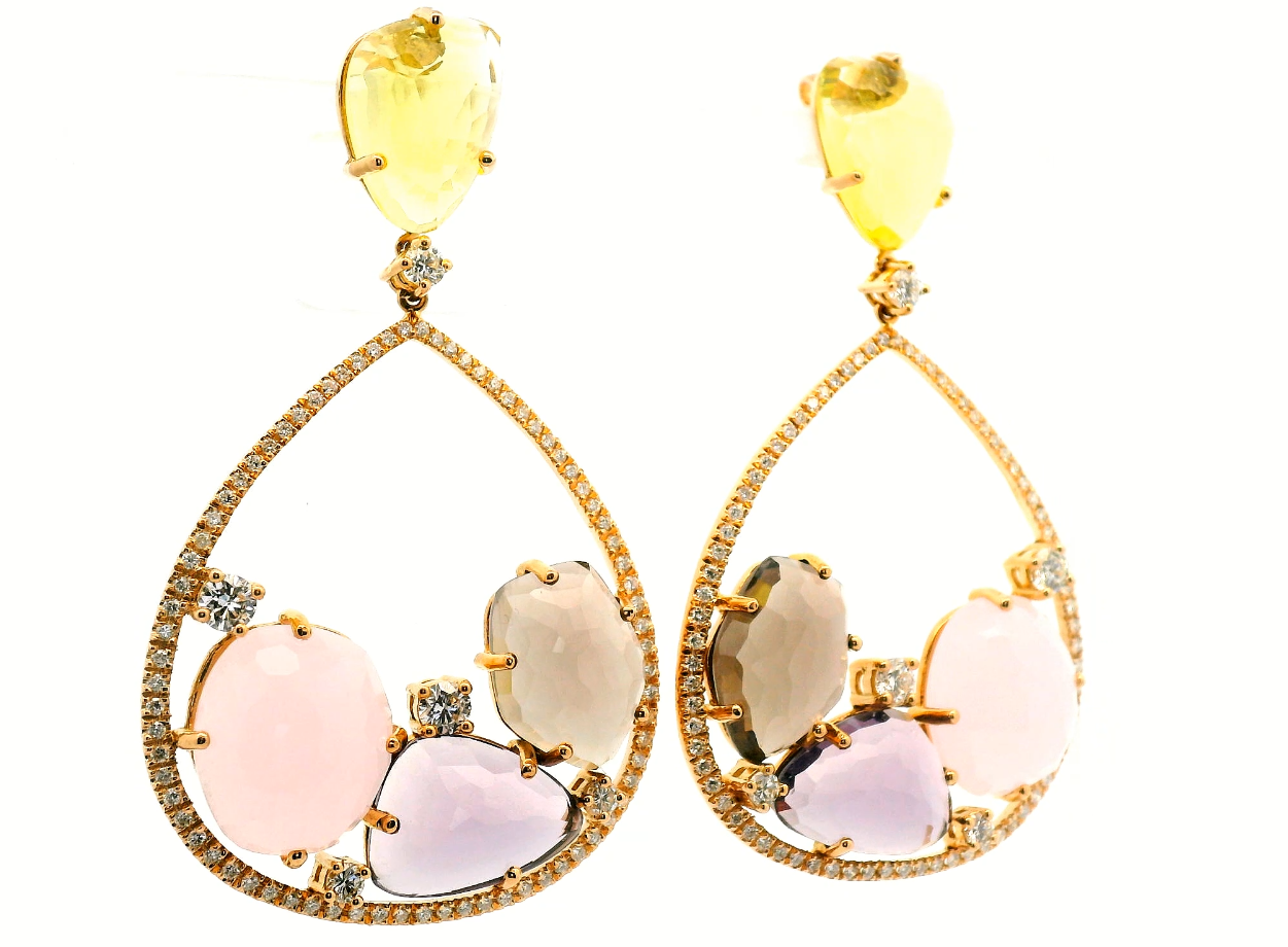 Представляем вашему вниманию золотые серьги с дымчатым кварцем 8.55ct, цветными ситаллами 33.65ct и бриллиантами 1.75ct.