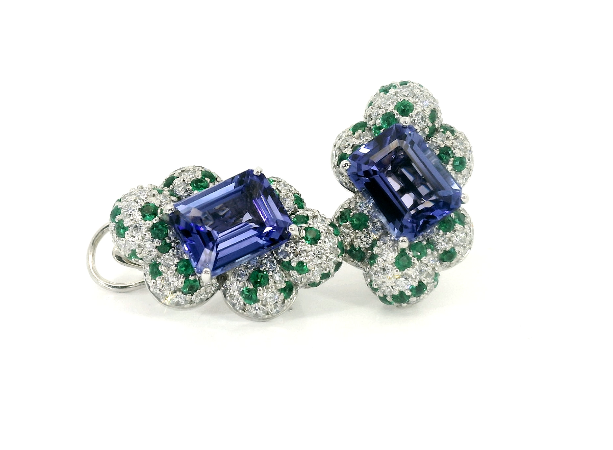 Представляем вашему вниманию золотые серьги с танзанитами 4.79ct, турмалинами параиба 0.02ct, изумрудами 0.79ct и бриллиантами 1.61ct.