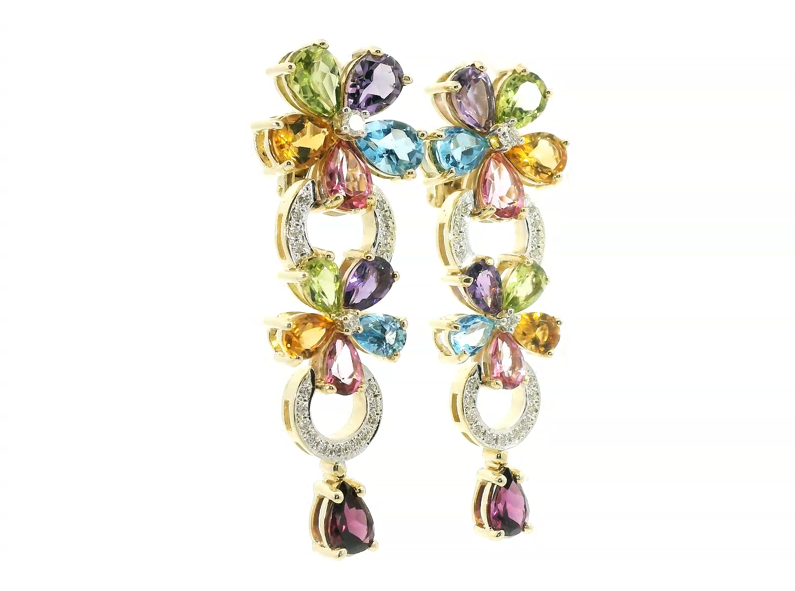 Представляем вашему вниманию золотые серьги с аметистами 1.86ct, цитринами 1.86ct, хризолитами 2.26ct, топазами 2.60ct, турмалинами 2.44ct, гранатами 1.70ct и бриллиантами 0.42ct.