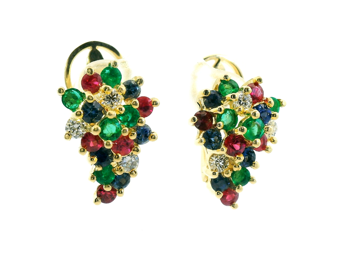 Представляем вашему вниманию золотые серьги с изумрудами 0.60ct, рубинами 0.80ct, сапфирами 0.80ct и бриллиантами 0.45ct.