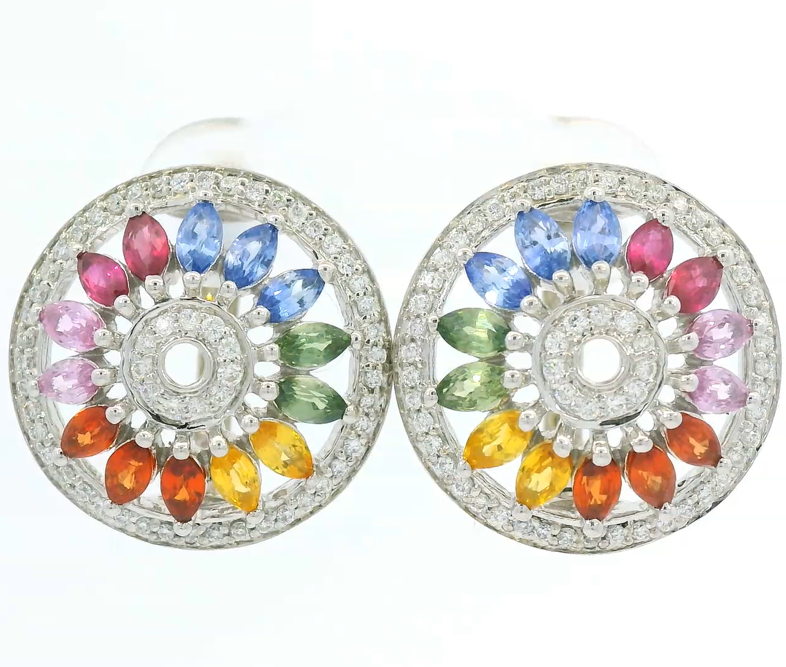 Представляем вашему вниманию золотые серьги с цветными сапфирами 1.90ct, сапфирами 0.64ct, рубинами 0.42ct и бриллиантами 0.48ct.