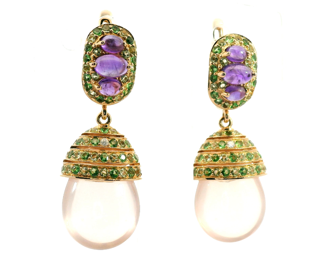 Представляем вашему вниманию золотые серьги с розовым кварцем 28.80ct, аметистами 1.34ct, хризолитами 1.24ct, тсаворитами 1.24ct и бриллиантами 0.03ct.
