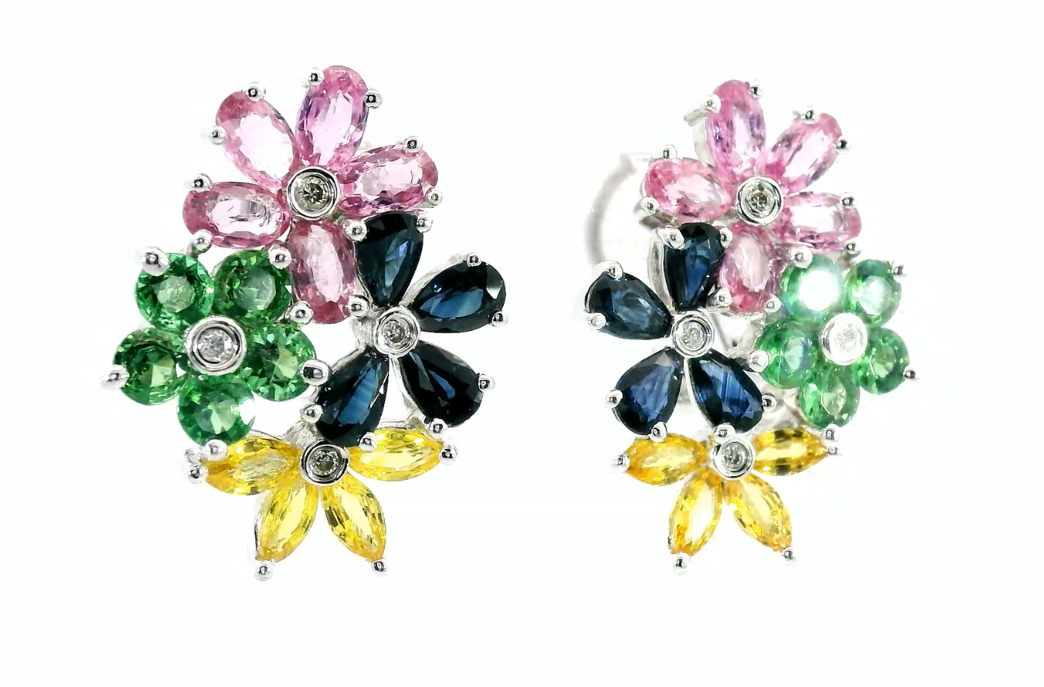 Представляем вашему вниманию золотые серьги с синими 2.16ct, розовыми 3.10ct и желтыми 1.28ct сапфирами, тсаворитами 1.50ct и бриллиантами 0.08ct.