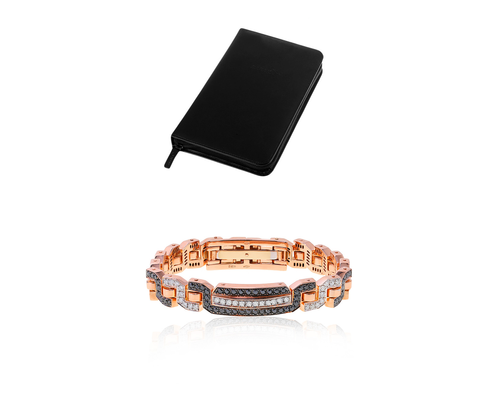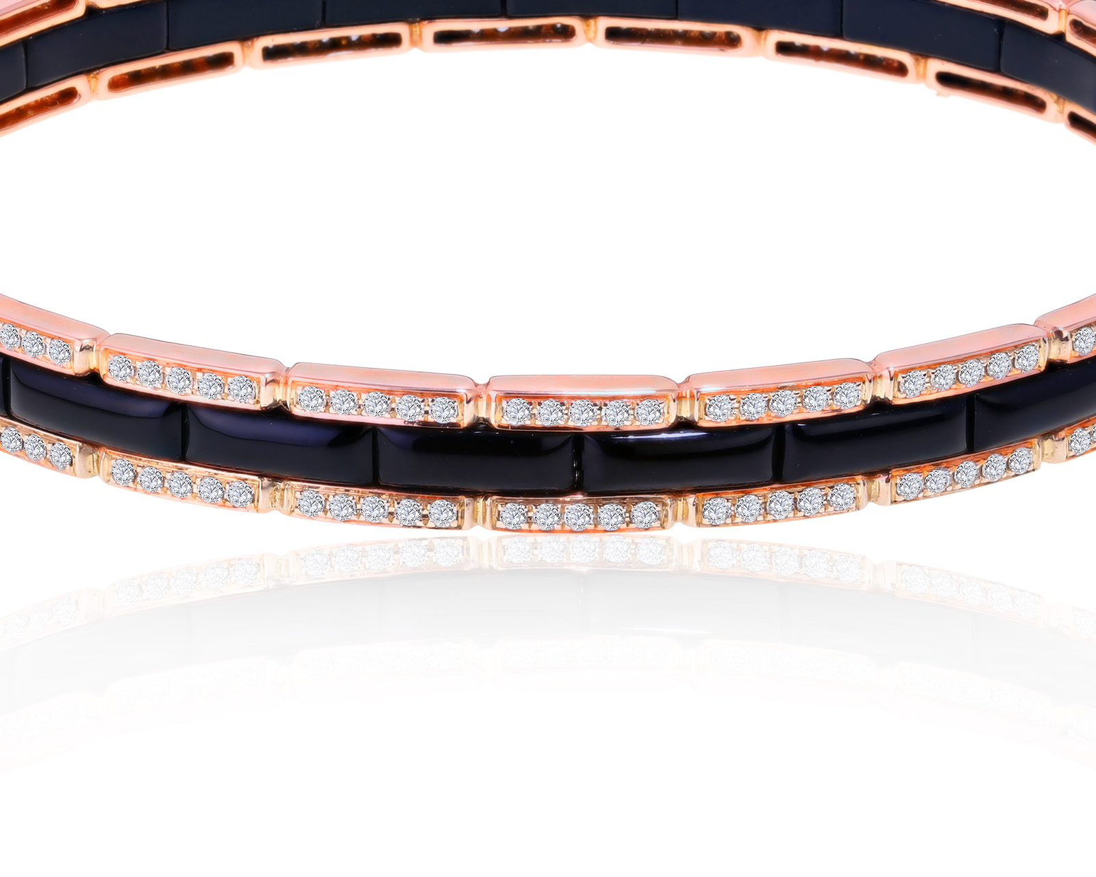 Изделия часто дополняют вставками керамики или каучука, которые красиво контрастируют с золотистым цветом драгоценного металла. Предпочитаете украшения с акцентами из камней? Купите модель с бесцветными, черными или коньячными бриллиантами.