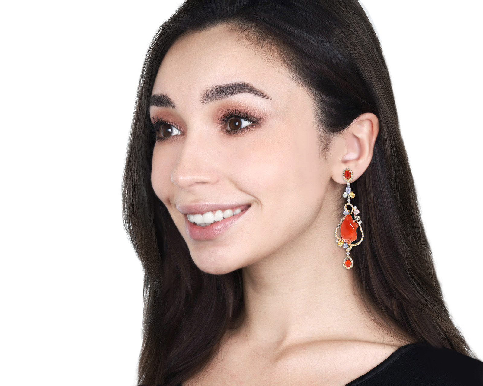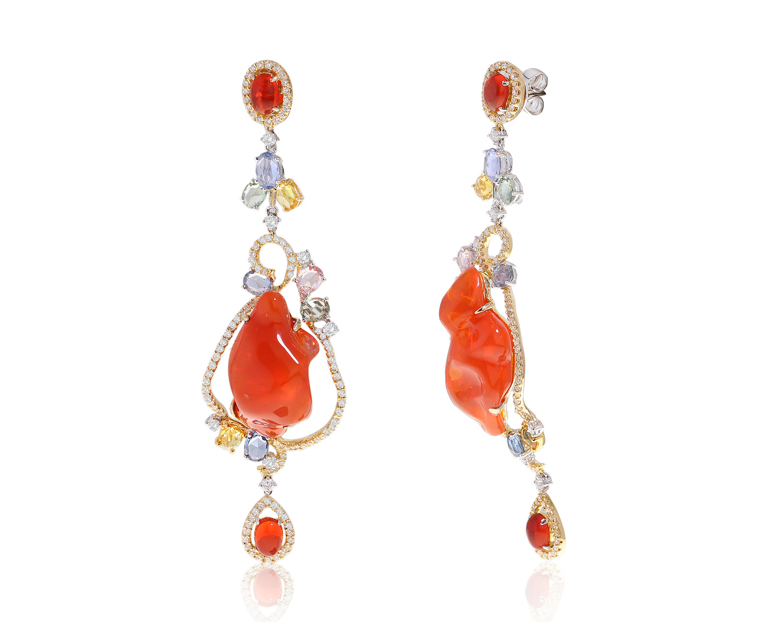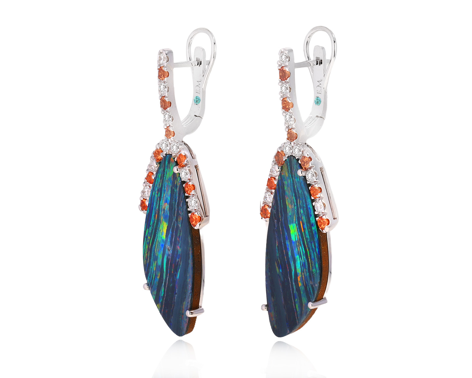 Серьги с эффектной выкладкой камней подчеркивают сияние глаз и освежают лицо. А крупный кулон с опалом привлекает взгляд к роскошному декольте и подходит для выходов в свет.