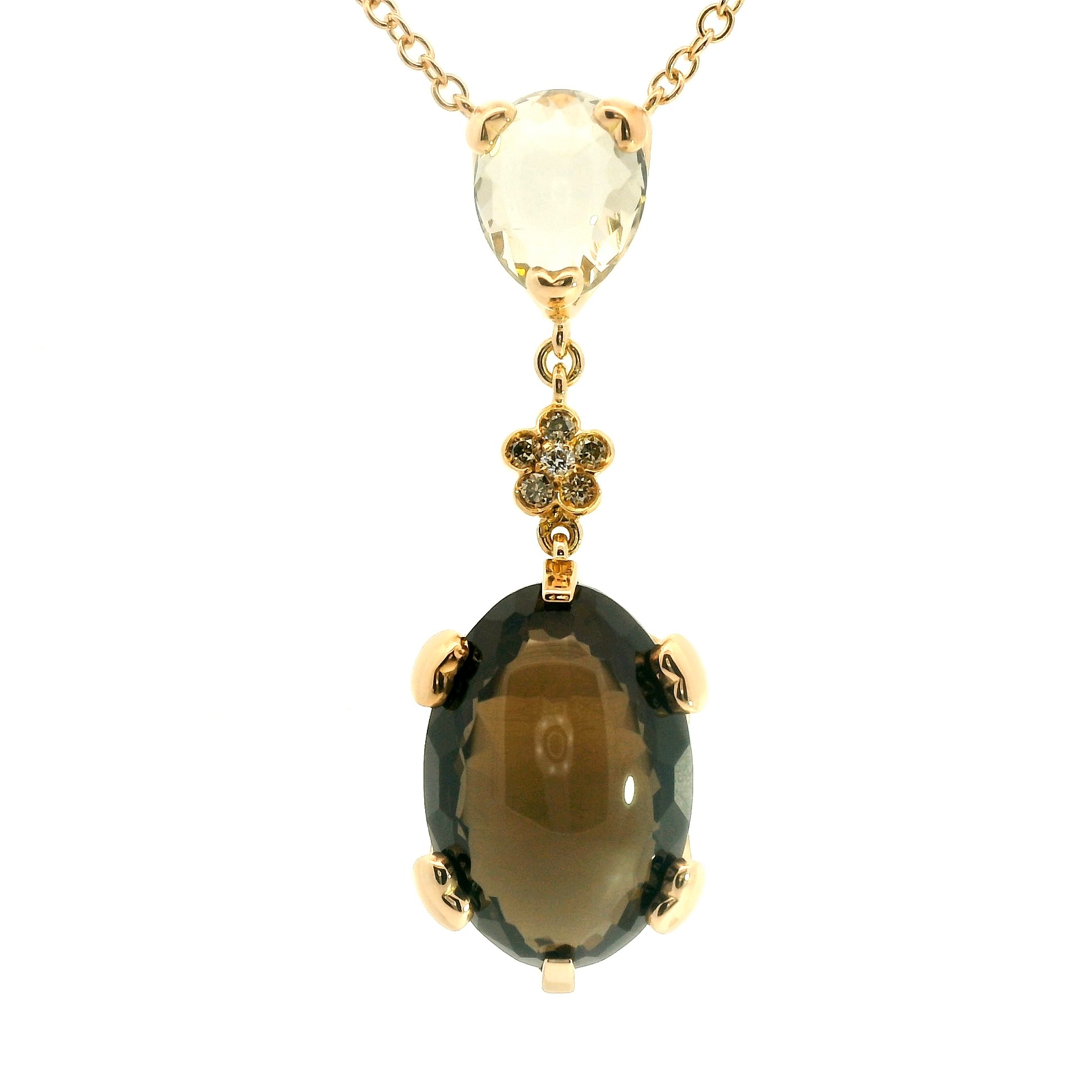 Представляем вашему вниманию оригинальное золотое колье с дымчатым кварцем 18.00ct, празиолитом 4.00ct, бесцветными 0.06ct и коньячными 0.15ct бриллиантами и рубином 0.03ct от всемирно известного бренда Pasquale Bruni.