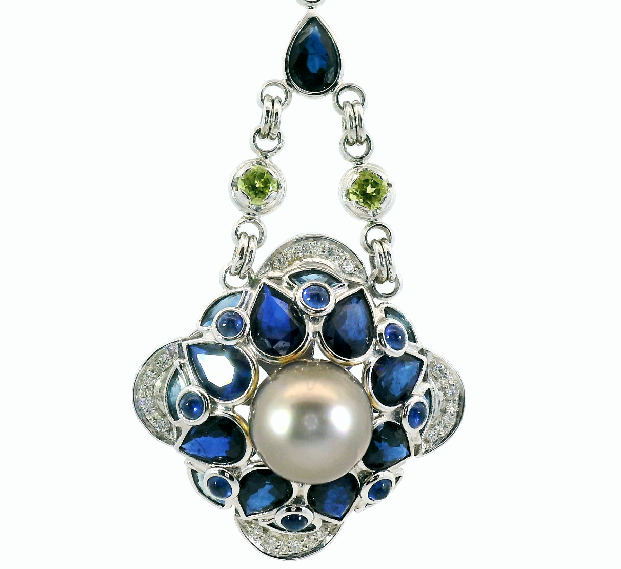 Представляем вашему вниманию оригинальное золотое колье с жемчугом 10.50 мм, сапфирами 10.24ct, хризолитами 1.12ct и бриллиантами 0.15ct от всемирно известного бренда Zancan.