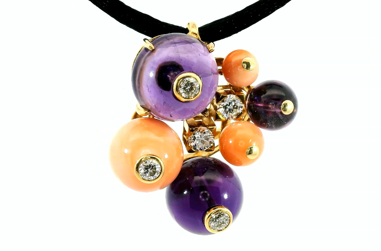 Представляем вашему вниманию оригинальную золотую подвеску с аметистами 10.10ct, кораллами 5.80ct и бриллиантами 0.42ct от всемирно известного бренда Cartier из коллекции Délices de Goa Dore.