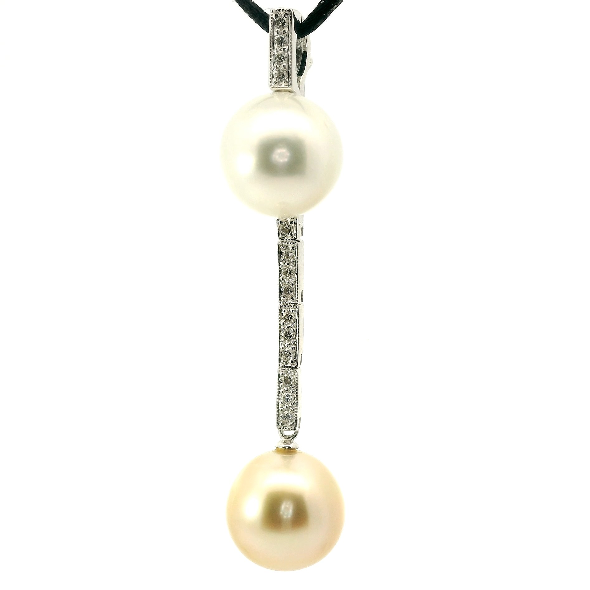 Представляем вашему вниманию оригинальную золотую подвеску с белым 11.60 мм и золотистым 11.80 мм жемчугом и бриллиантами 0.14ct от всемирно известного бренда WCJ.