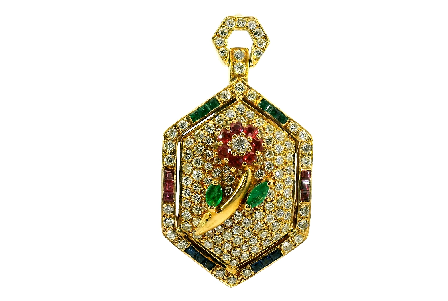 Представляем вашему вниманию прекрасную золотую подвеску с бриллиантами 1.52ct, рубинами 0.52ct, сапфирами 0.24ct и изумрудами 0.45ct.