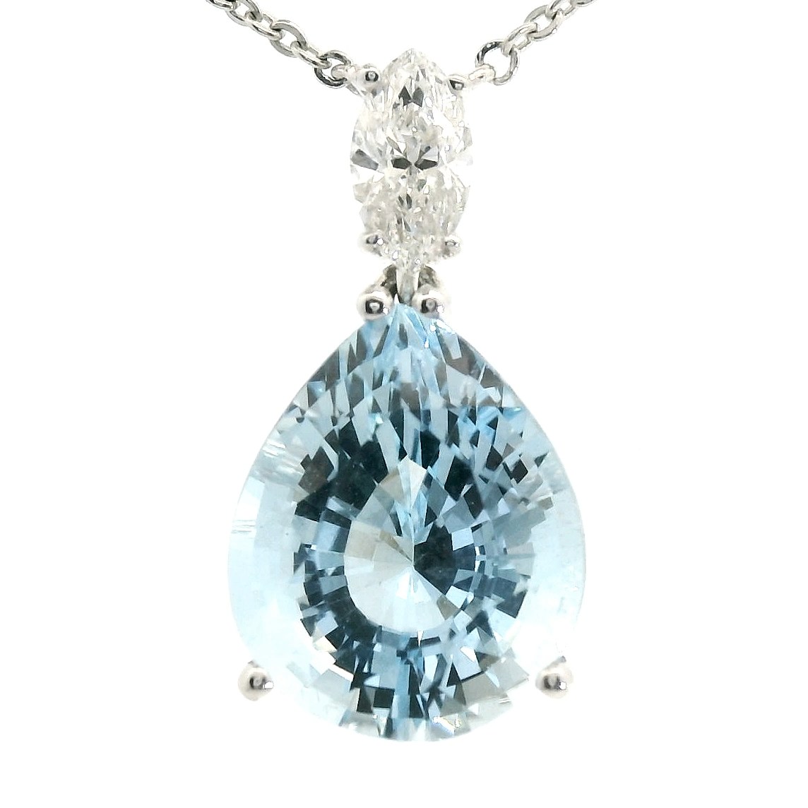 Представляем вашему вниманию золотое колье с аквамарином 2.95ct, турмалином параиба 0.01ct и бриллиантом 0.21ct.