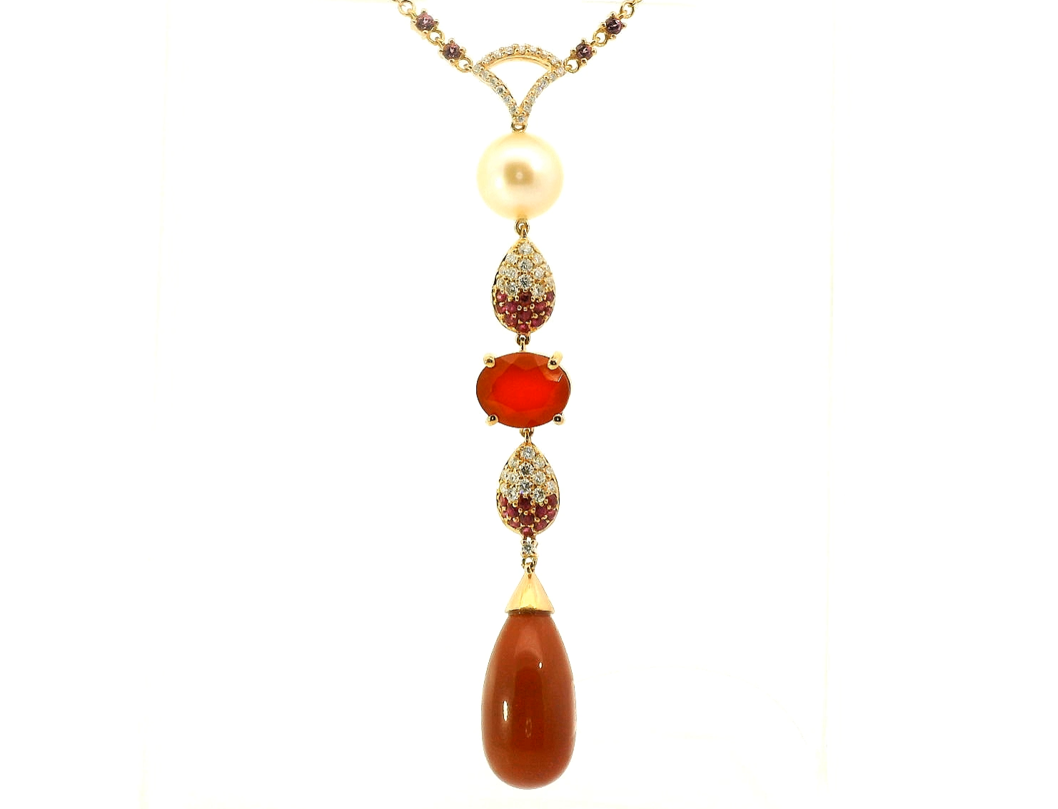 Представляем вашему вниманию золотое колье с розовым жемчугом 9.38ct, сердоликом 14.30ct, гранатами 0.16ct, розовыми сапфирами 0.44ct и бриллиантами 0.38ct.