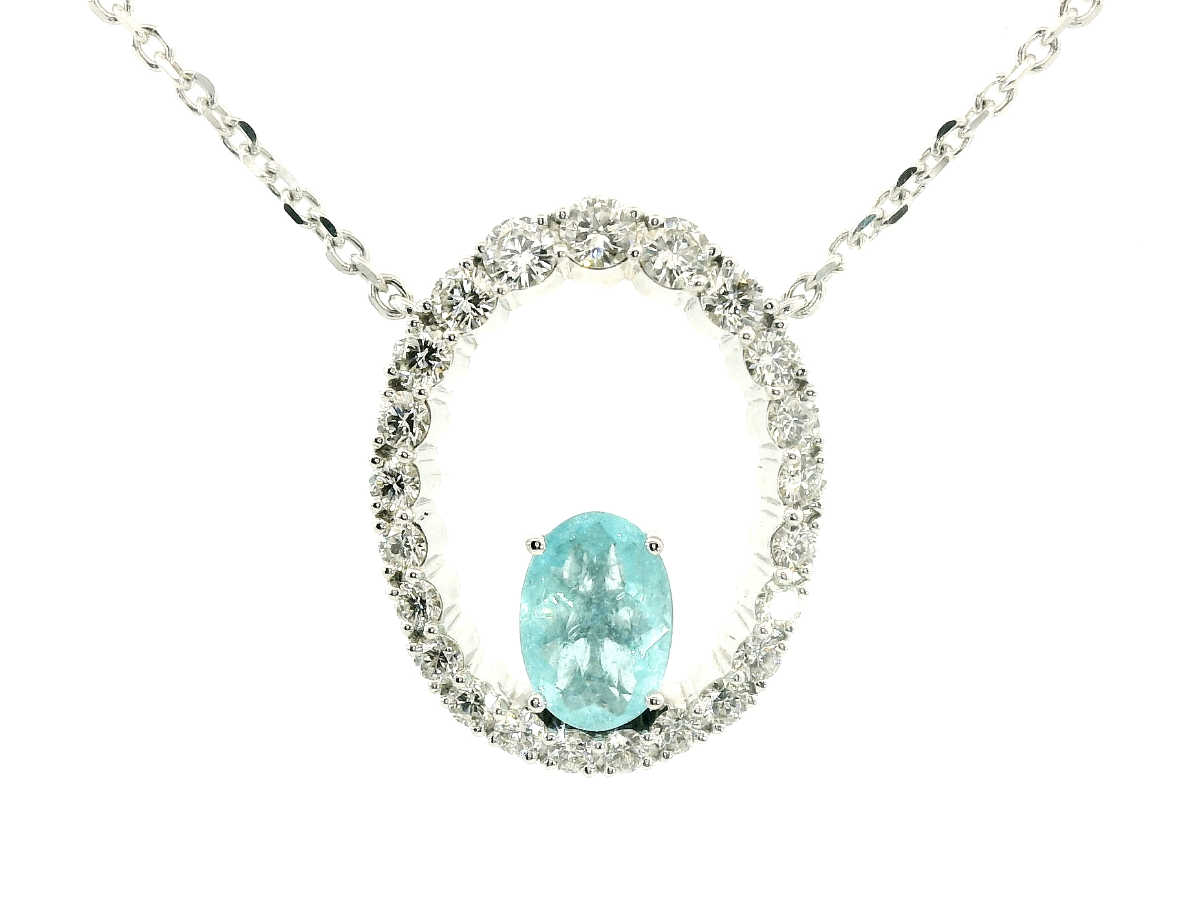 Представляем вашему вниманию золотое колье с турмалином параиба Мозамбик 0.62ct, бриллиантами 0.55ct и турмалином параиба 0.01ct.