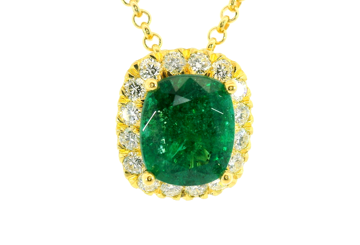Представляем вашему вниманию золотую подвеску с изумрудом Замбия 3.08ct, турмалином параиба 0.02ct и бриллиантами 0.56ct.