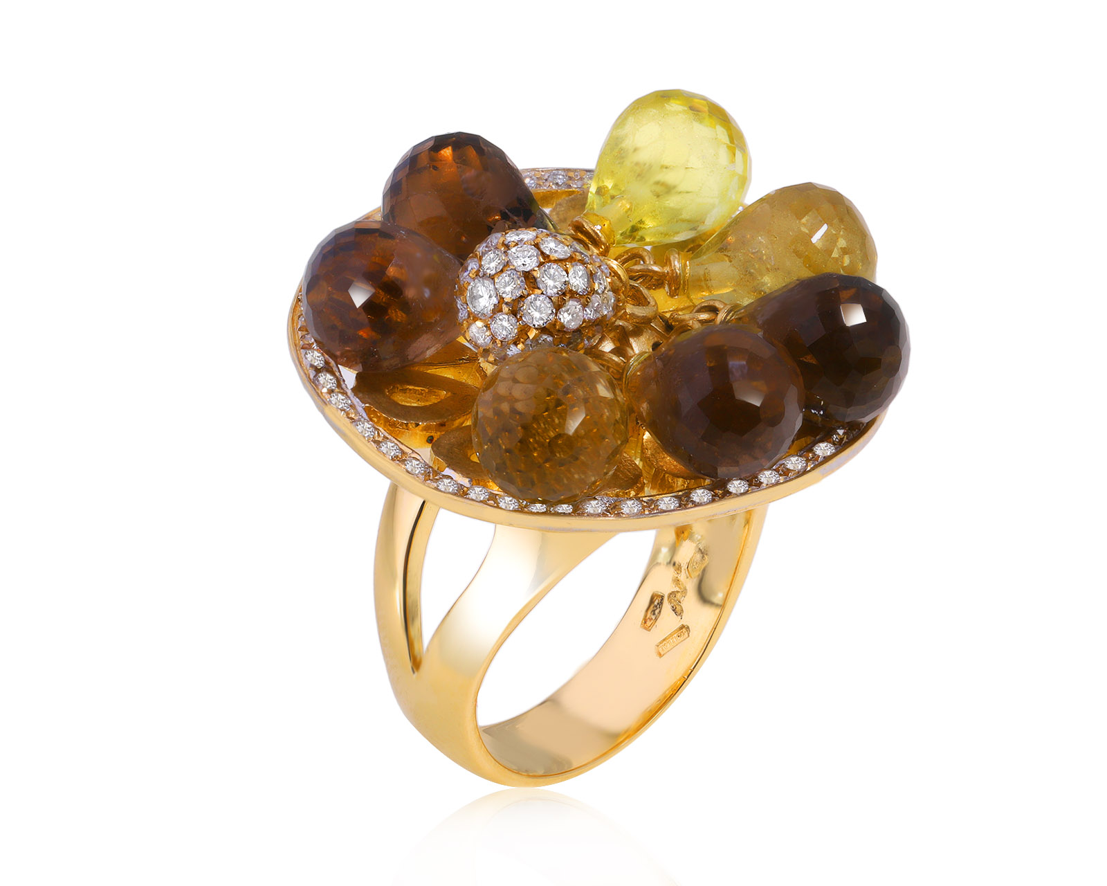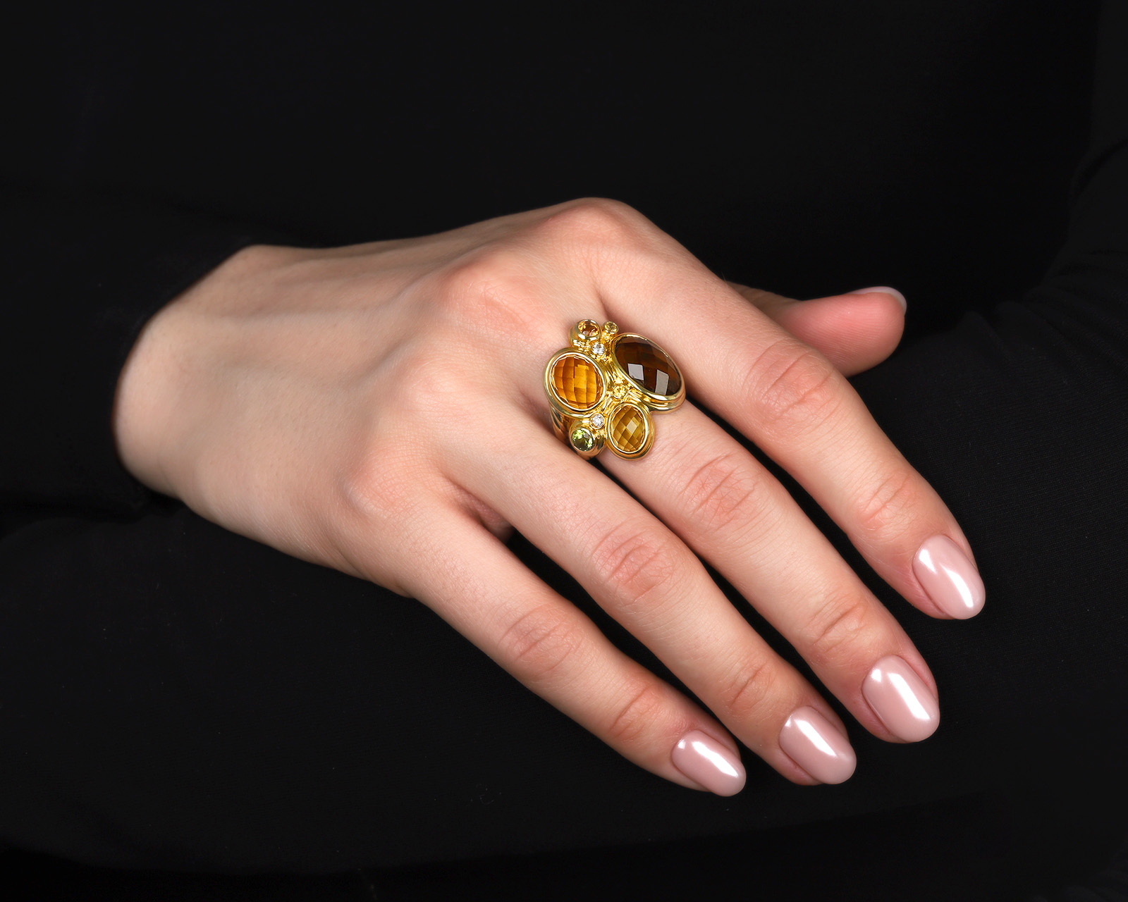 Цитрин представлен впечатляющей палитрой желтых оттенков — от лимонных до насыщенно-коричневых. Этот камень подходит женщинам и мужчинам, красиво выглядит в кольцах из красного, желтого и белого золота. Дизайнеры используют сияющий самоцвет для создания лаконичных повседневных и роскошных праздничных украшений.