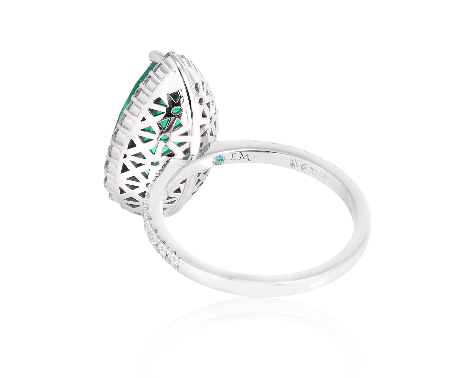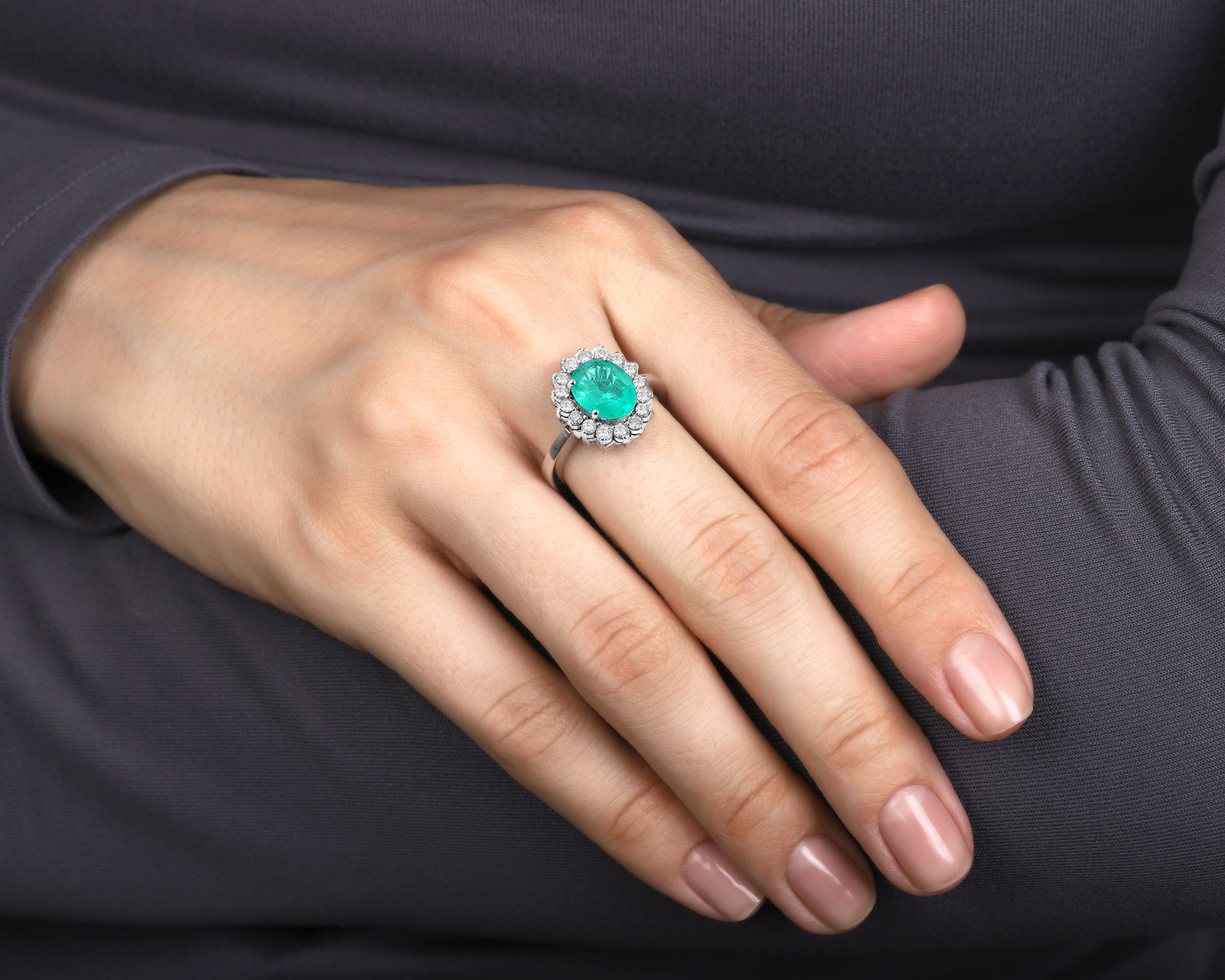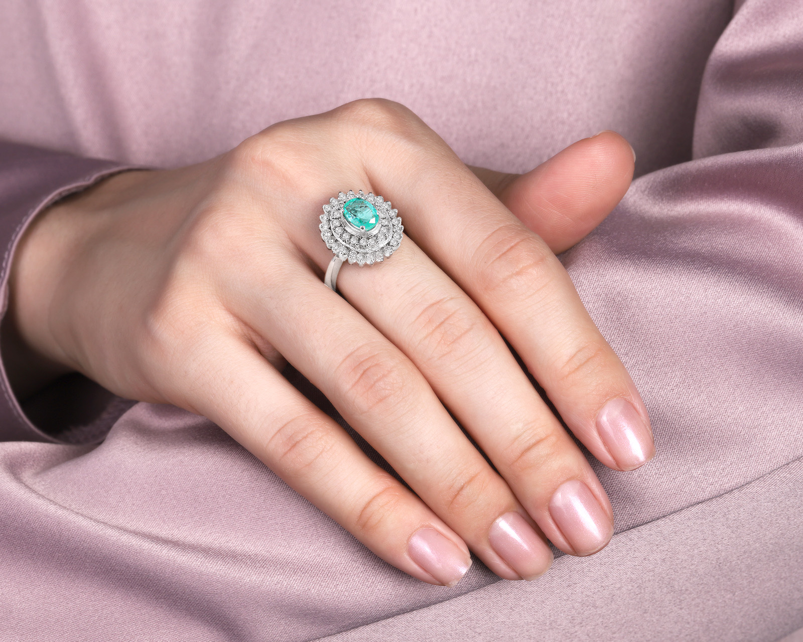 Камень относится к малочисленной группе драгоценных и подчеркивает исключительность избранницы в том числе благодаря высокой цене. Зеленый минерал славится великолепной игрой цвета и смотрится еще наряднее в окружении бесцветных бриллиантов.
