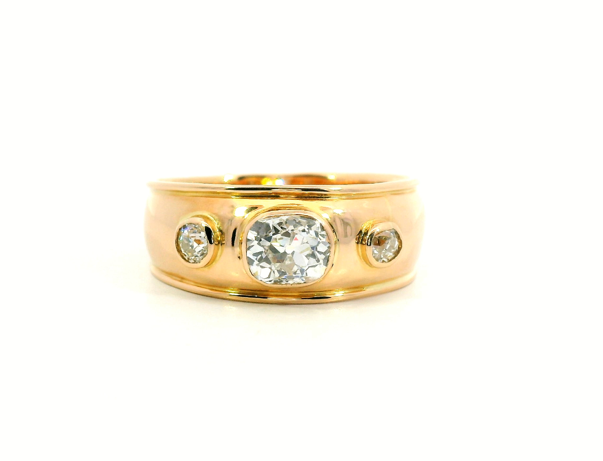 Изысканное золотое кольцо с бриллиантами 1.10ct — настоящее произведение искусства, в котором воплощено не только мастерство ювелира, но и актуальные тренды. Это доказательство вашего изысканного вкуса, высокого статуса и яркий акцент в стильном образе. Вставка — 1 бриллиант старинной огранки "кушон" 0.85ct 6/9 (H/I1), 2 бриллианта старинной круглой огранки 0.25ct 3/5, ширина кольца 9.0 мм, а обрамлением служит золото 585 пробы. Такое сочетание отлично смотрится и позволяет реализовывать самые необычные задумки вашего стиля. Размер ювелирного изделия — 20.5, бесплатно изменим на любой от 18.5 до 21.5, а общий вес — 6.03 г, и на пальце оно выглядит просто шикарно, сразу привлекая восхищенное внимание.