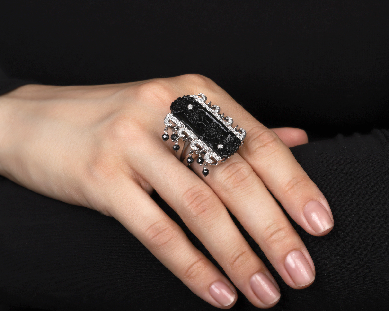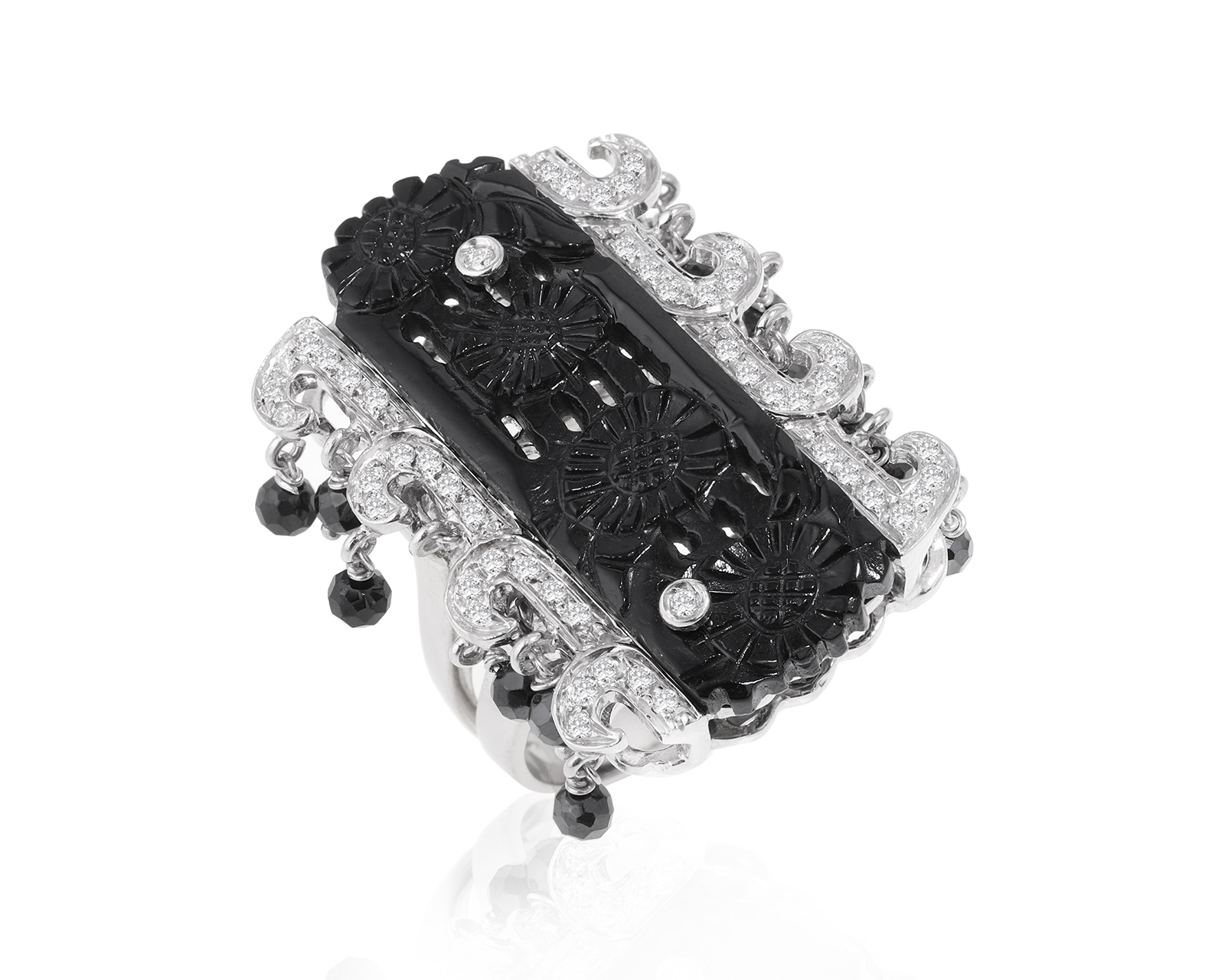 Оникс представлен в природе широкой палитрой оттенков: белых, зеленых, голубых, розовых, коричневых. Самыми ценными и эффектными считаются черные камни с выраженными белыми прослойками или совсем незаметными полосами, которые активно используют для изготовления колец. Ювелирные изделия представлены в коллекциях Chanel, Fani, Corsi, Magerit, Bvlgari, Carl F. Bucherer, Di Modolo и других именитых брендов. Также предлагаем кольца с ониксом без указания бренда, которые сопровождаются экспертным заключением геммолога МГУ.