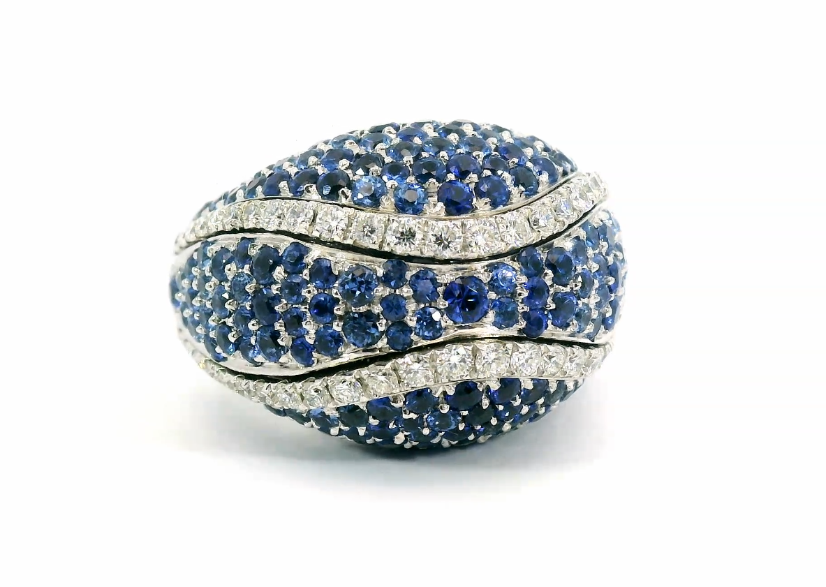 Оригинальное золотое кольцо c сапфирами 4.69ct Damiani Match Ball — настоящее произведение искусства, в котором воплощено не только мастерство ювелира, но и актуальные тренды. Это доказательство вашего изысканного вкуса, высокого статуса и яркий акцент в стильном образе. Вставка — 175 сапфиров круглой огранки 4.69ct 2/2-5/3, 52 бриллианта круглой огранки 0.77ct 3/3-3/4, а обрамлением служит золото 750 пробы. Такое сочетание отлично смотрится и позволяет реализовывать самые необычные задумки вашего стиля. Размер ювелирного изделия — 16.75, а общий вес — 21.82 г, и на пальце оно выглядит просто шикарно, сразу привлекая восхищенное внимание.