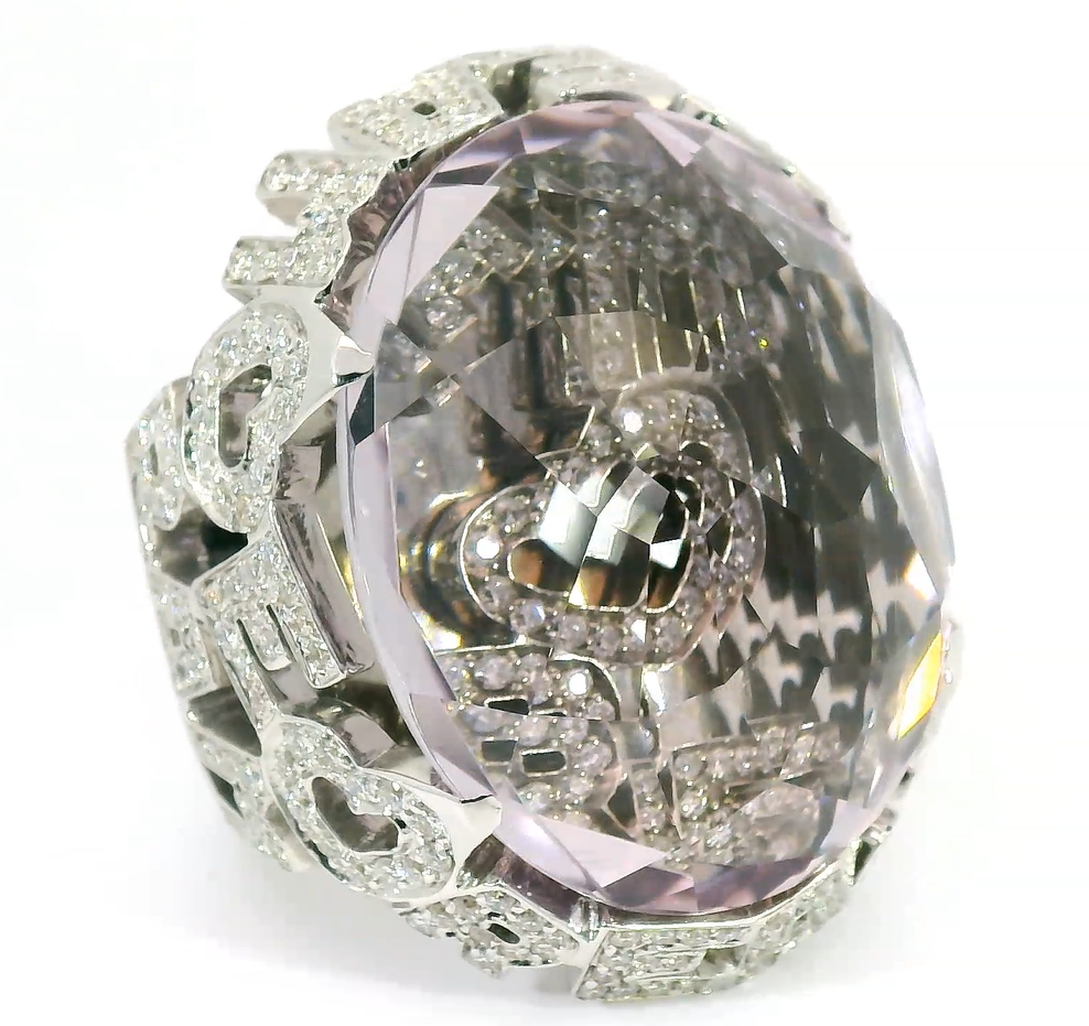 Оригинальное золотое кольцо с аметистом 40.39ct Pasquale Bruni Amore — настоящее произведение искусства, в котором воплощено не только мастерство ювелира, но и актуальные тренды. Это доказательство вашего изысканного вкуса, высокого статуса и яркий акцент в стильном образе. Вставка — 1 аметист огранки "фантазийный овал" 40.39ct, 260 бриллиантов круглой огранки 1.56ct 3/3-3/4, а обрамлением служит золото 750 пробы. Такое сочетание отлично смотрится и позволяет реализовывать самые необычные задумки вашего стиля. Размер ювелирного изделия — 15.75, а общий вес — 40.31 г, и на пальце оно выглядит просто шикарно, сразу привлекая восхищенное внимание.
