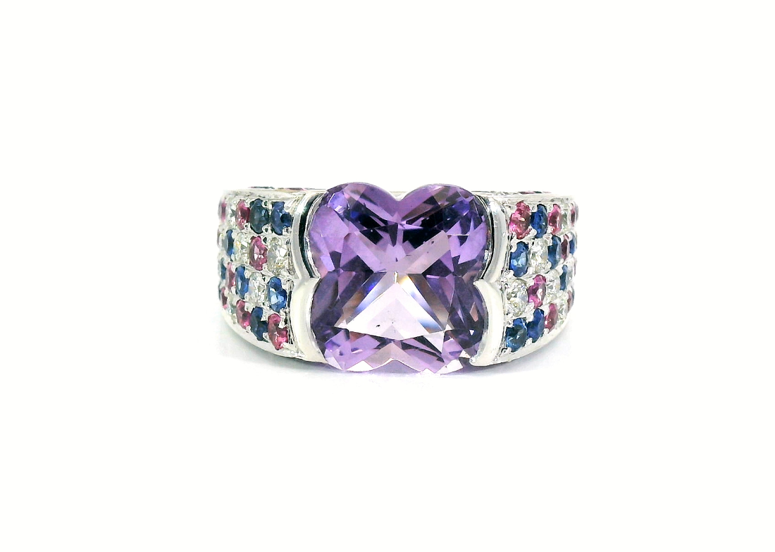 Оригинальное золотое кольцо с аметистом 5.00ct Maubousssin — настоящее произведение искусства, в котором воплощено не только мастерство ювелира, но и актуальные тренды. Это доказательство вашего изысканного вкуса, высокого статуса и яркий акцент в стильном образе. Вставка — 1 аметист фантазийной огранки 5.00ct, 30 бриллиантов круглой огранки 0.33ct 3/3-3/4, 34 сапфира круглой огранки 1.02ct, 32 сапфира круглой огранки 0.95ct, а обрамлением служит золото 750 пробы. Такое сочетание отлично смотрится и позволяет реализовывать самые необычные задумки вашего стиля. Размер ювелирного изделия — 16.5, бесплатно изменим на любой от 14.5 до 16.25, а общий вес — 12.31 г, и на пальце оно выглядит просто шикарно, сразу привлекая восхищенное внимание.