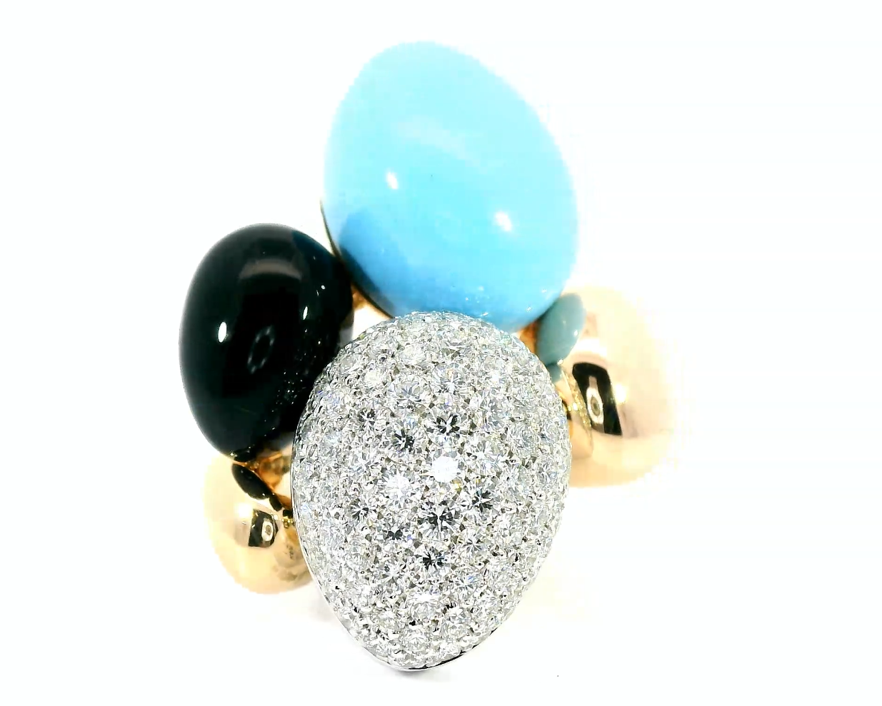 Оригинальное золотое кольцо с бирюзой 11.30ct Roberto Coin Ikebana — настоящее произведение искусства, в котором воплощено не только мастерство ювелира, но и актуальные тренды. Это доказательство вашего изысканного вкуса, высокого статуса и яркий акцент в стильном образе. Вставка — 1 бирюза огранки "фантазийный кабошон" 11.30ct, 1 оникс огранки "фантазийный кабошон" 4.00ct, 1 рубин круглой огранки 0.02ct 3/2, 96 бриллиантов круглой огранки 1.54ct 2/2-3/4, а обрамлением служит золото 750 пробы. Такое сочетание отлично смотрится и позволяет реализовывать самые необычные задумки вашего стиля. Размер ювелирного изделия — 16.75, бесплатно изменим на любой от 16.25 до 17.25, а общий вес — 16.31 г, и на пальце оно выглядит просто шикарно, сразу привлекая восхищенное внимание.