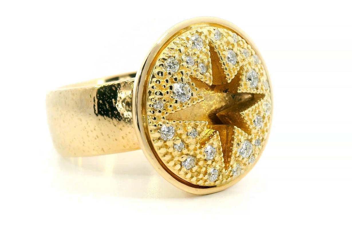 Оригинальное золотое кольцо с бриллиантами 0.25ct Mizuki Star — настоящее произведение искусства, в котором воплощено не только мастерство ювелира, но и актуальные тренды. Это доказательство вашего изысканного вкуса, высокого статуса и яркий акцент в стильном образе. Вставка — 25 бриллиантов круглой огранки 0.25ct 3/3-3/4, а обрамлением служит золото 585 пробы. Такое сочетание отлично смотрится и позволяет реализовывать самые необычные задумки вашего стиля. Размер ювелирного изделия — 17.75, бесплатно изменим на любой от 15.75 до 19.25, а общий вес — 23.94 г, и на пальце оно выглядит просто шикарно, сразу привлекая восхищенное внимание.