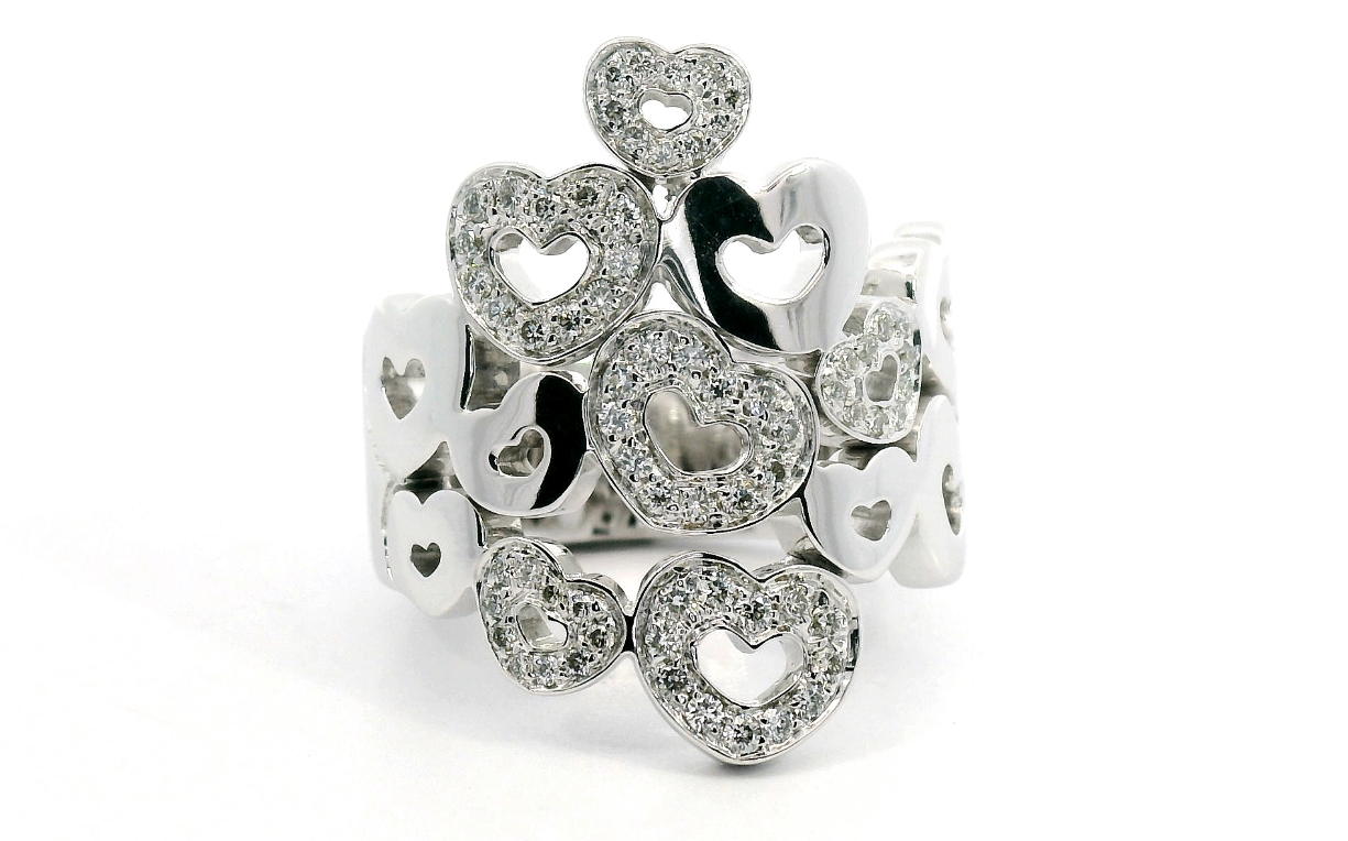Оригинальное золотое кольцо с бриллиантами 0.37ct Pasquale Bruni Amore — настоящее произведение искусства, в котором воплощено не только мастерство ювелира, но и актуальные тренды. Это доказательство вашего изысканного вкуса, высокого статуса и яркий акцент в стильном образе. Вставка — 66 бриллиантов круглой огранки 0.37ct 3/2-3/3, а обрамлением служит золото 750 пробы. Такое сочетание отлично смотрится и позволяет реализовывать самые необычные задумки вашего стиля. Размер ювелирного изделия — 16, бесплатно изменим на любой от 15.5 до 16.5, а общий вес — 15.88 г, и на пальце оно выглядит просто шикарно, сразу привлекая восхищенное внимание.