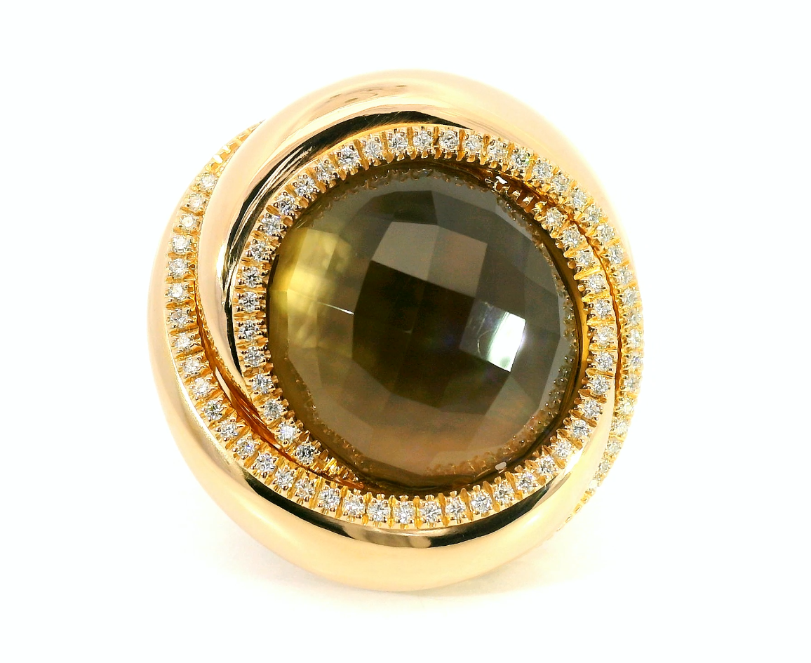 Оригинальное золотое кольцо с бриллиантами 0.45ct Effepi Gioielli — настоящее произведение искусства, в котором воплощено не только мастерство ювелира, но и актуальные тренды. Это доказательство вашего изысканного вкуса, высокого статуса и яркий акцент в стильном образе. Вставка — 1 кварц круглой огранки 18.42ct, 75 бриллиантов круглой огранки 0.45ct 3/3-4/3, а обрамлением служит золото 750 пробы. Такое сочетание отлично смотрится и позволяет реализовывать самые необычные задумки вашего стиля. Размер ювелирного изделия — 17.25, бесплатно изменим на любой от 16.75 до 18.25, а общий вес — 30.88 г, и на пальце оно выглядит просто шикарно, сразу привлекая восхищенное внимание.