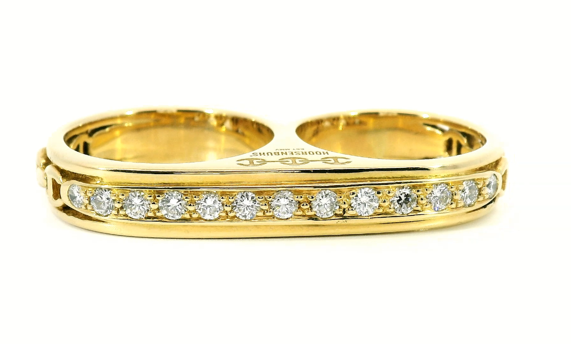 Оригинальное золотое кольцо с бриллиантами 0.56ct Hoorsenbuhs Double Barrel Knuckle — настоящее произведение искусства, в котором воплощено не только мастерство ювелира, но и актуальные тренды. Это доказательство вашего изысканного вкуса, высокого статуса и яркий акцент в стильном образе. Вставка — 13 бриллиантов круглой огранки 0.56ct 3/3-4/4, а обрамлением служит золото 750 пробы. Такое сочетание отлично смотрится и позволяет реализовывать самые необычные задумки вашего стиля. Размер ювелирного изделия — 15.75, бесплатно изменим на 17.25, а общий вес — 17.36 г, и на пальце оно выглядит просто шикарно, сразу привлекая восхищенное внимание.