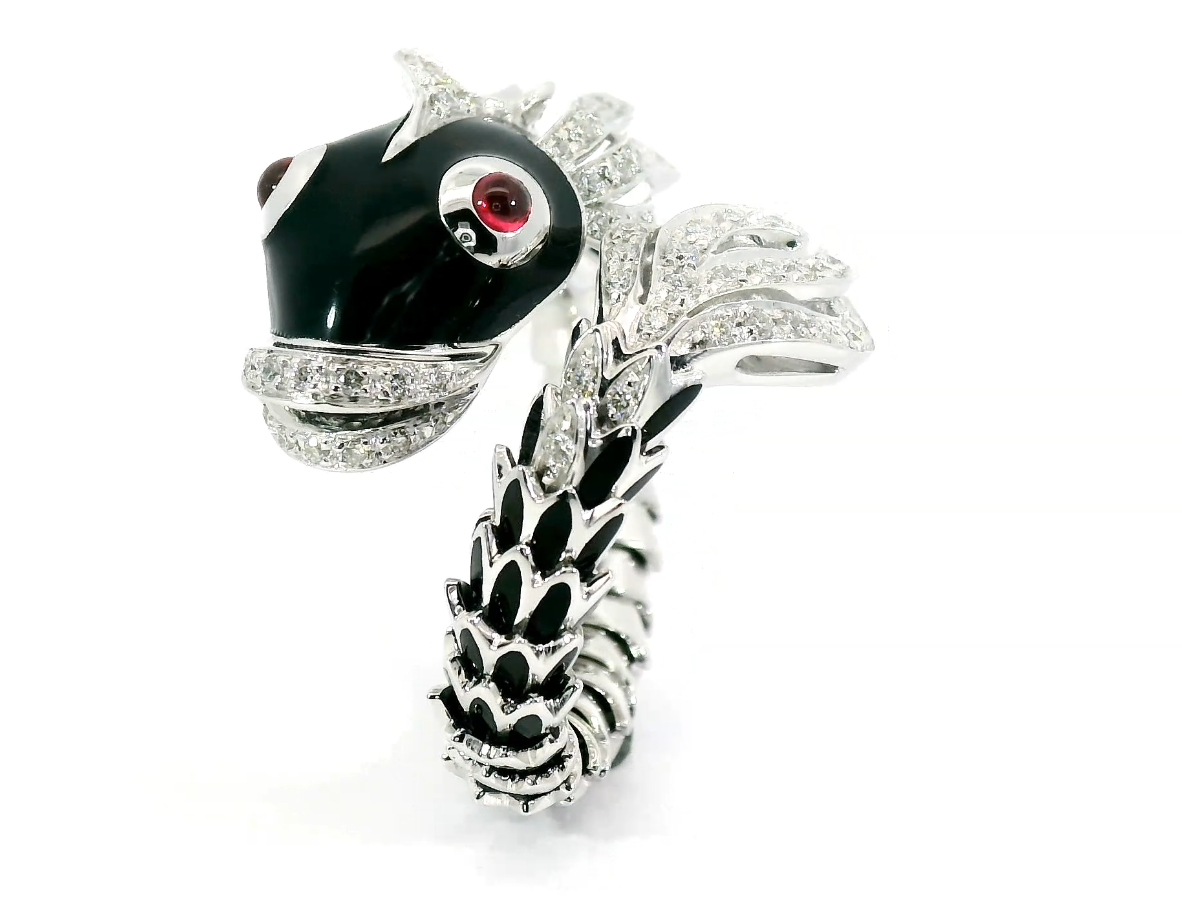 Оригинальное золотое кольцо с бриллиантами 0.67ct Roberto Coin Animalier Nemo — настоящее произведение искусства, в котором воплощено не только мастерство ювелира, но и актуальные тренды. Это доказательство вашего изысканного вкуса, высокого статуса и яркий акцент в стильном образе. Вставка — 2 рубина огранки "круглый кабошон" 0.16ct 3/2, 1 рубин круглой огранки 0.04ct 3/2, 90 бриллиантов круглой огранки 0.67ct 3/3-3/4, а обрамлением служит золото 750 пробы. Такое сочетание отлично смотрится и позволяет реализовывать самые необычные задумки вашего стиля. Размер ювелирного изделия — 17.5, а общий вес — 18.94 г, и на пальце оно выглядит просто шикарно, сразу привлекая восхищенное внимание.