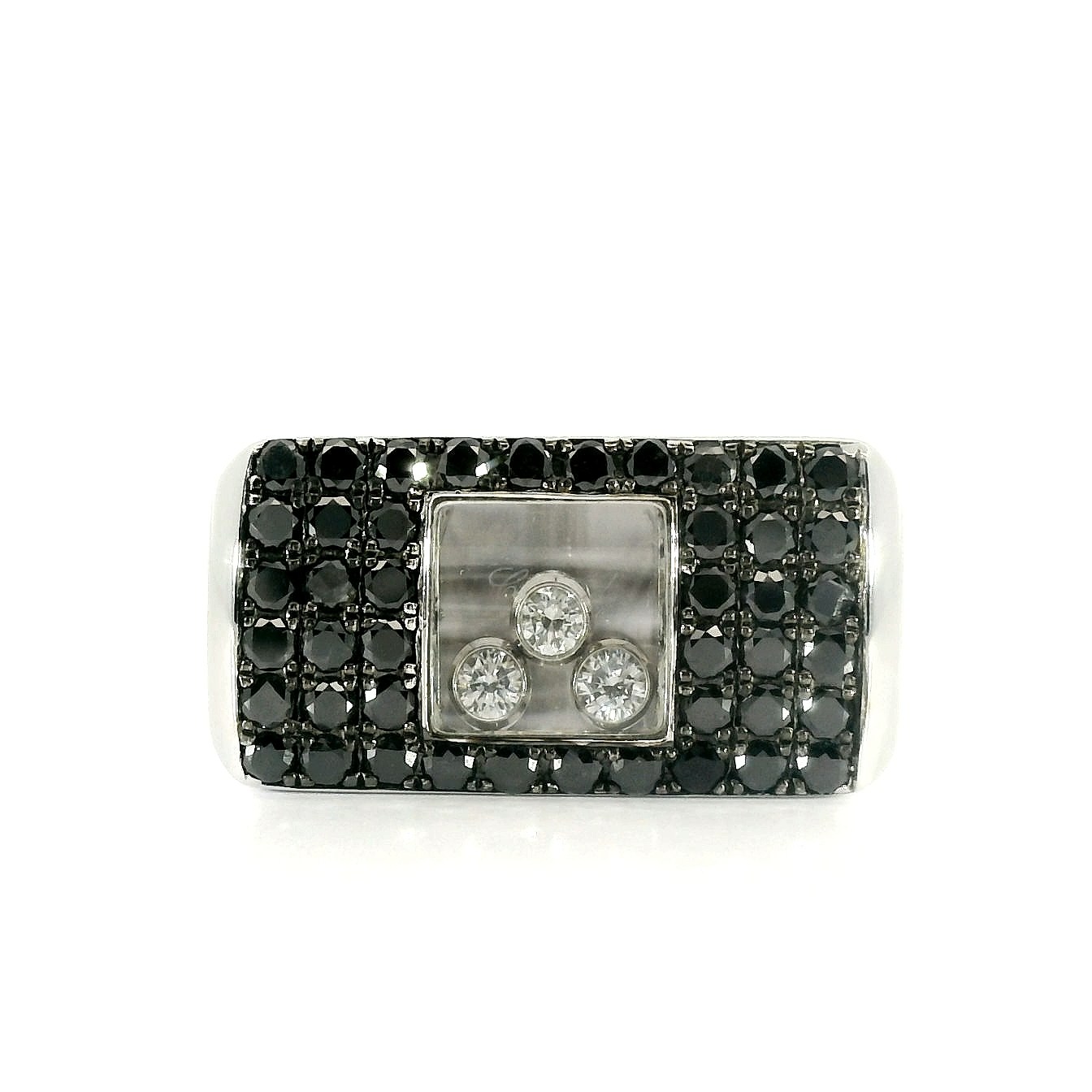 Оригинальное золотое кольцо с бриллиантами 1.07ct Chopard Happy Diamonds — настоящее произведение искусства, в котором воплощено не только мастерство ювелира, но и актуальные тренды. Это доказательство вашего изысканного вкуса, высокого статуса и яркий акцент в стильном образе. Вставка — 3 бриллианта круглой огранки 0.15ct 3/3, 44 черных бриллианта круглой огранки 0.92ct 7/9, а обрамлением служит золото 750 пробы. Такое сочетание отлично смотрится и позволяет реализовывать самые необычные задумки вашего стиля. Размер ювелирного изделия — 16.5, а общий вес — 16.42 г, и на пальце оно выглядит просто шикарно, сразу привлекая восхищенное внимание.