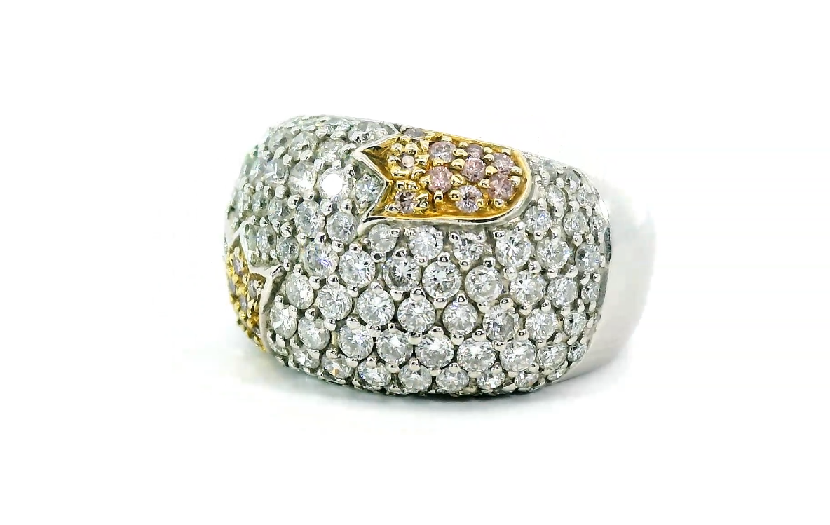 Оригинальное золотое кольцо с бриллиантами 1.56ct Tous — настоящее произведение искусства, в котором воплощено не только мастерство ювелира, но и актуальные тренды. Это доказательство вашего изысканного вкуса, высокого статуса и яркий акцент в стильном образе. Вставка — 100 бриллиантов круглой огранки 1.40ct 3/3-3/5, 20 бриллиантов круглой огранки 0.16ct pink/5-6, а обрамлением служит золото 750 пробы. Такое сочетание отлично смотрится и позволяет реализовывать самые необычные задумки вашего стиля. Размер ювелирного изделия — 15.5, бесплатно изменим на любой от 13.5 до 16.5, а общий вес — 9.98 г, и на пальце оно выглядит просто шикарно, сразу привлекая восхищенное внимание.