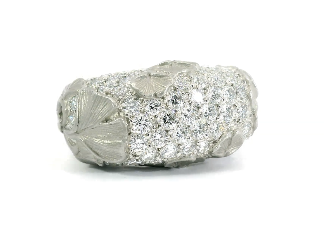 Оригинальное золотое кольцо с бриллиантами 2.13ct Carrera y Carrera Ginkgo Leaf — настоящее произведение искусства, в котором воплощено не только мастерство ювелира, но и актуальные тренды. Это доказательство вашего изысканного вкуса, высокого статуса и яркий акцент в стильном образе. Вставка — 64 бриллианта круглой огранки 2.13ct 2/2-3/3, а обрамлением служит золото 750 пробы. Такое сочетание отлично смотрится и позволяет реализовывать самые необычные задумки вашего стиля. Размер ювелирного изделия — 16.5, бесплатно изменим на любой от 14.5 до 17.5, а общий вес — 14.79 г, и на пальце оно выглядит просто шикарно, сразу привлекая восхищенное внимание.