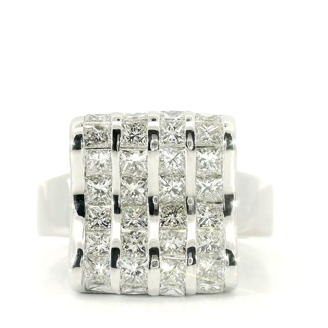 Оригинальное золотое кольцо с бриллиантами 2.88ct Luca Carati — настоящее произведение искусства, в котором воплощено не только мастерство ювелира, но и актуальные тренды. Это доказательство вашего изысканного вкуса, высокого статуса и яркий акцент в стильном образе. Вставка — 32 бриллианта огранки "принцесса" 2.88ct 3/3-3/4, а обрамлением служит золото 750 пробы. Такое сочетание отлично смотрится и позволяет реализовывать самые необычные задумки вашего стиля. Размер ювелирного изделия — 16.75, бесплатно изменим на любой от 15.75 до 17.75, а общий вес — 12.54 г, и на пальце оно выглядит просто шикарно, сразу привлекая восхищенное внимание.