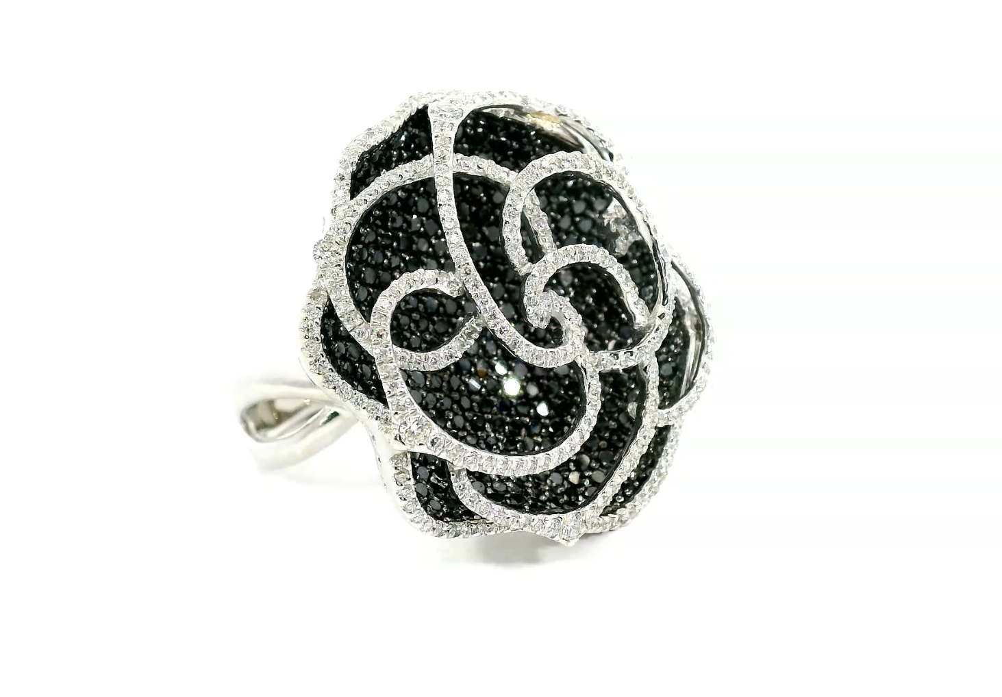 Оригинальное золотое кольцо с бриллиантами 4.67ct Yanush — настоящее произведение искусства, в котором воплощено не только мастерство ювелира, но и актуальные тренды. Это доказательство вашего изысканного вкуса, высокого статуса и яркий акцент в стильном образе. Вставка — 253 бриллианта круглой огранки 1.17ct 3/4-4/5, 350 черных бриллиантов круглой огранки 3.50ct 7/9, а обрамлением служит золото 750 пробы. Такое сочетание отлично смотрится и позволяет реализовывать самые необычные задумки вашего стиля. Размер ювелирного изделия — 18.5, бесплатно изменим на любой от 17.5 до 20, а общий вес — 21.16 г, и на пальце оно выглядит просто шикарно, сразу привлекая восхищенное внимание.